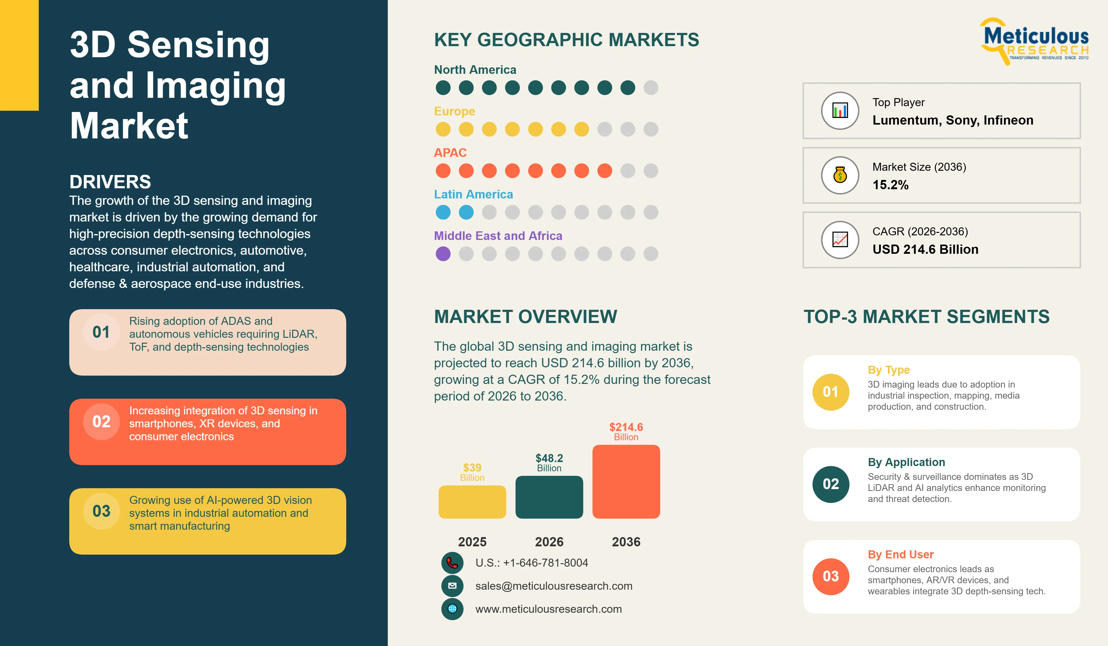 Report ID: MRICT - 104674 Pages: 350 Mar-2026 Formats*: PDF Category: Information and Communications Technology Delivery: 24 to 48 Hours Download Free Sample ReportThe global 3D sensing and imaging market was valued at USD 39.0 billion in 2025 and is projected to reach USD 214.6 billion by 2036 from USD 48.2 billion in 2026, growing at a CAGR of 15.2% during the forecast period of 2026 to 2036.