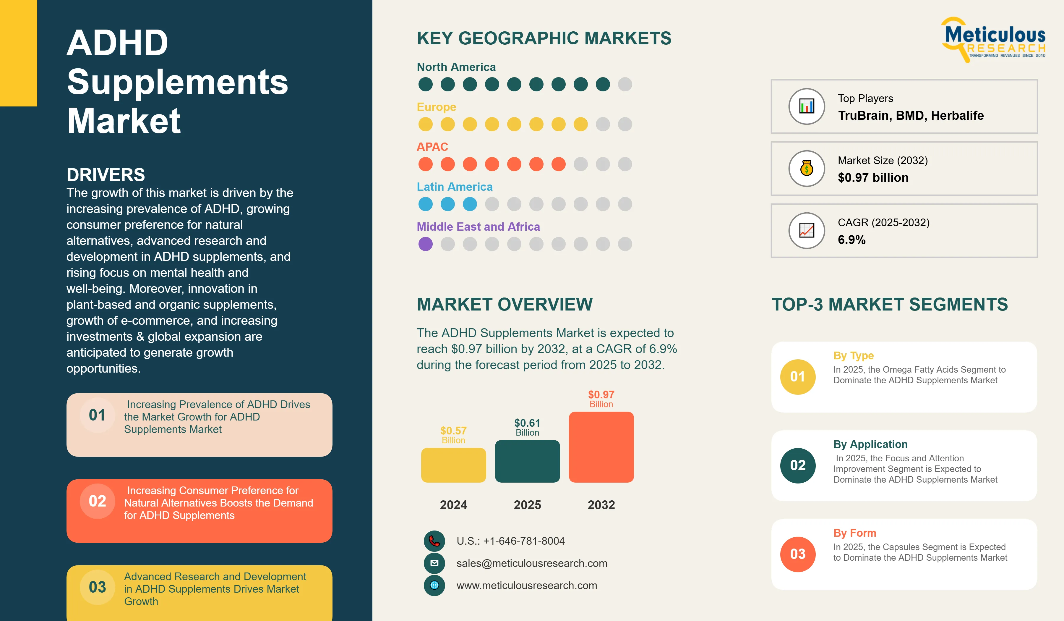The ADHD supplements market analysis indicates significant growth, reaching $ 0.97 billion by 2032 at a compound annual growth rate (CAGR) of 6.9 % from 2025 to 2032.