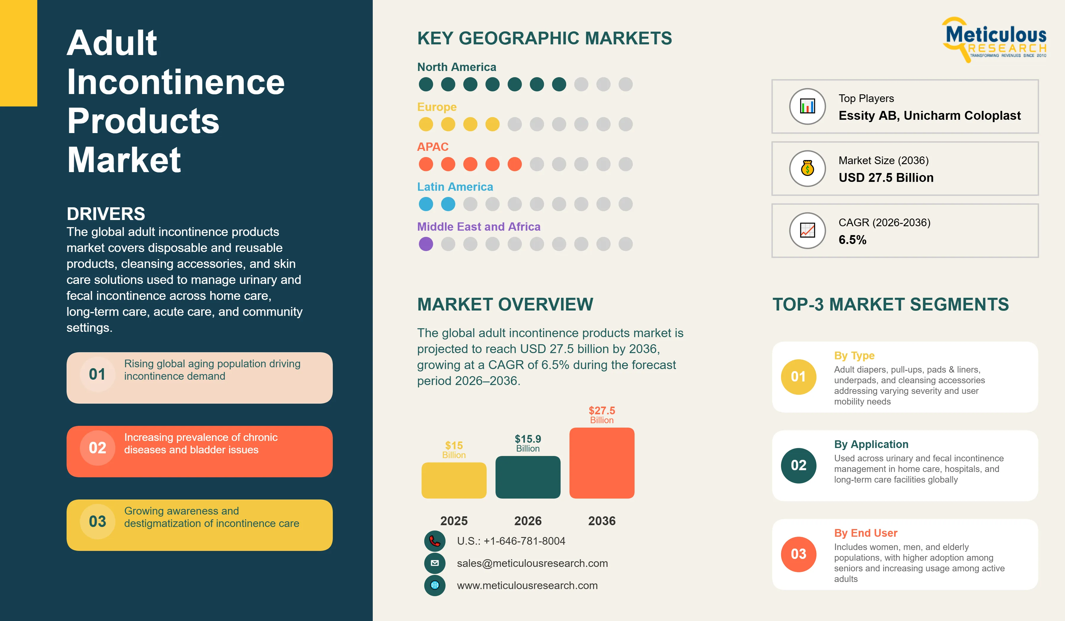 Report ID: MRHC - 1041927 Pages: 265 Apr-2026 Formats*: PDF Category: Healthcare Delivery: 24 to 72 Hours Download Free Sample ReportThe global adult incontinence products market was valued at USD 15.0 billion in 2025. The market is projected to reach USD 27.5 billion by 2036 from an estimated USD 15.9 billion in 2026, growing at a CAGR of 6.5% during the forecast period 2026–2036.