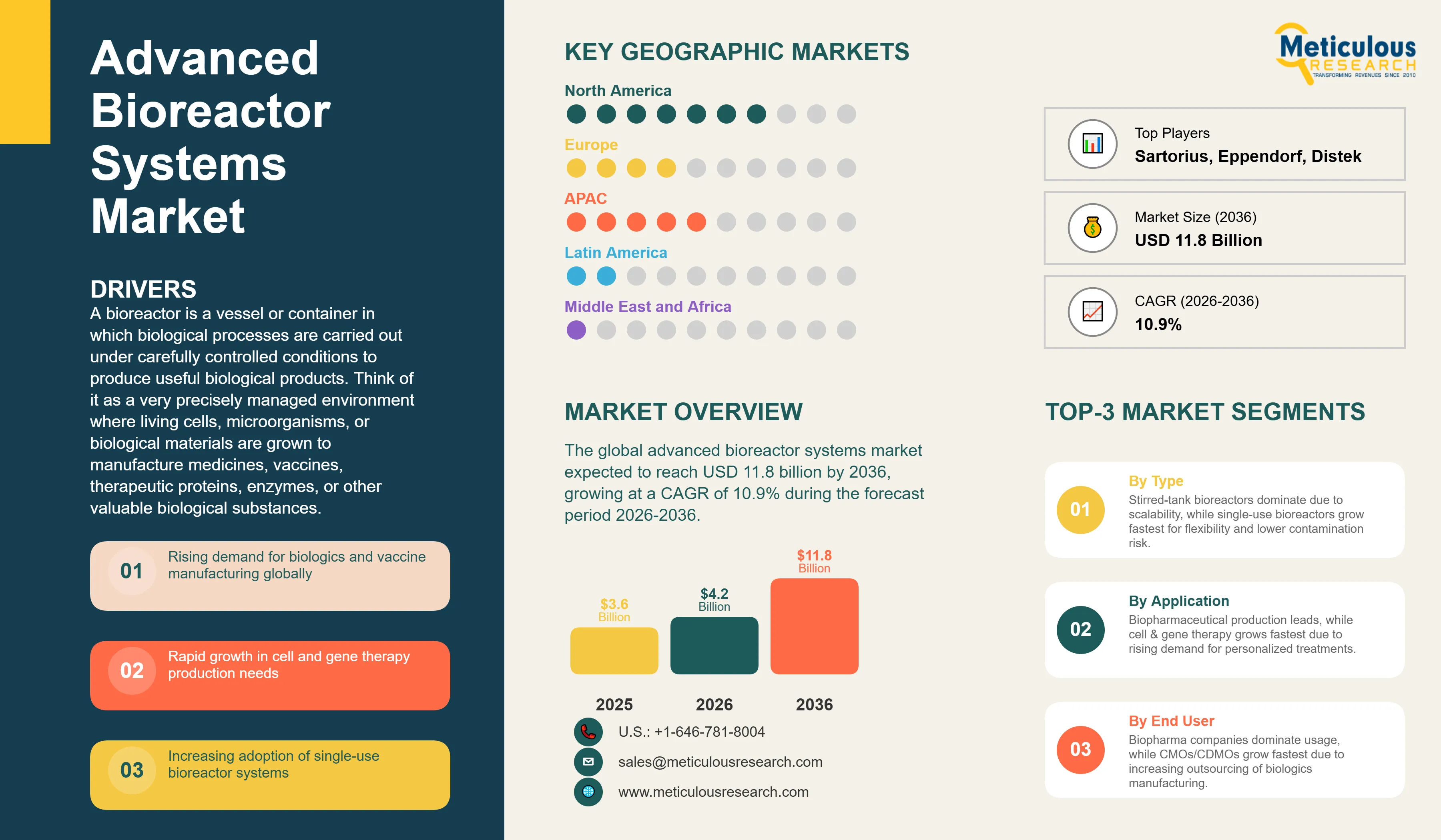 The primary driver of the advanced bioreactor equipment market is the sustained and rapid growth of the global biopharmaceuticals market, which has become the largest and fastest-growing segment of the pharmaceutical industry over the past two decades. Monoclonal antibodies, which are manufactured using bioreactor-based mammalian cell culture processes, generated over USD 200 billion in global sales and represent the majority of the world's top-selling drugs, including blockbuster cancer treatments, autoimmune disease therapies, and inflammatory condition treatments that each individually generate billions of dollars in annual revenue. Every gram of monoclonal antibody product requires dedicated bioreactor capacity to manufacture, and the continued growth of the global monoclonal antibody market at double-digit annual rates creates proportional demand growth for the bioreactor systems used to produce them. The global COVID-19 vaccination campaign also demonstrated that rapid large-scale vaccine manufacturing requires substantial bioreactor capacity, and the resulting investment by governments and pharmaceutical companies in domestic vaccine manufacturing infrastructure has created lasting new demand for bioreactor systems at manufacturing sites around the world.