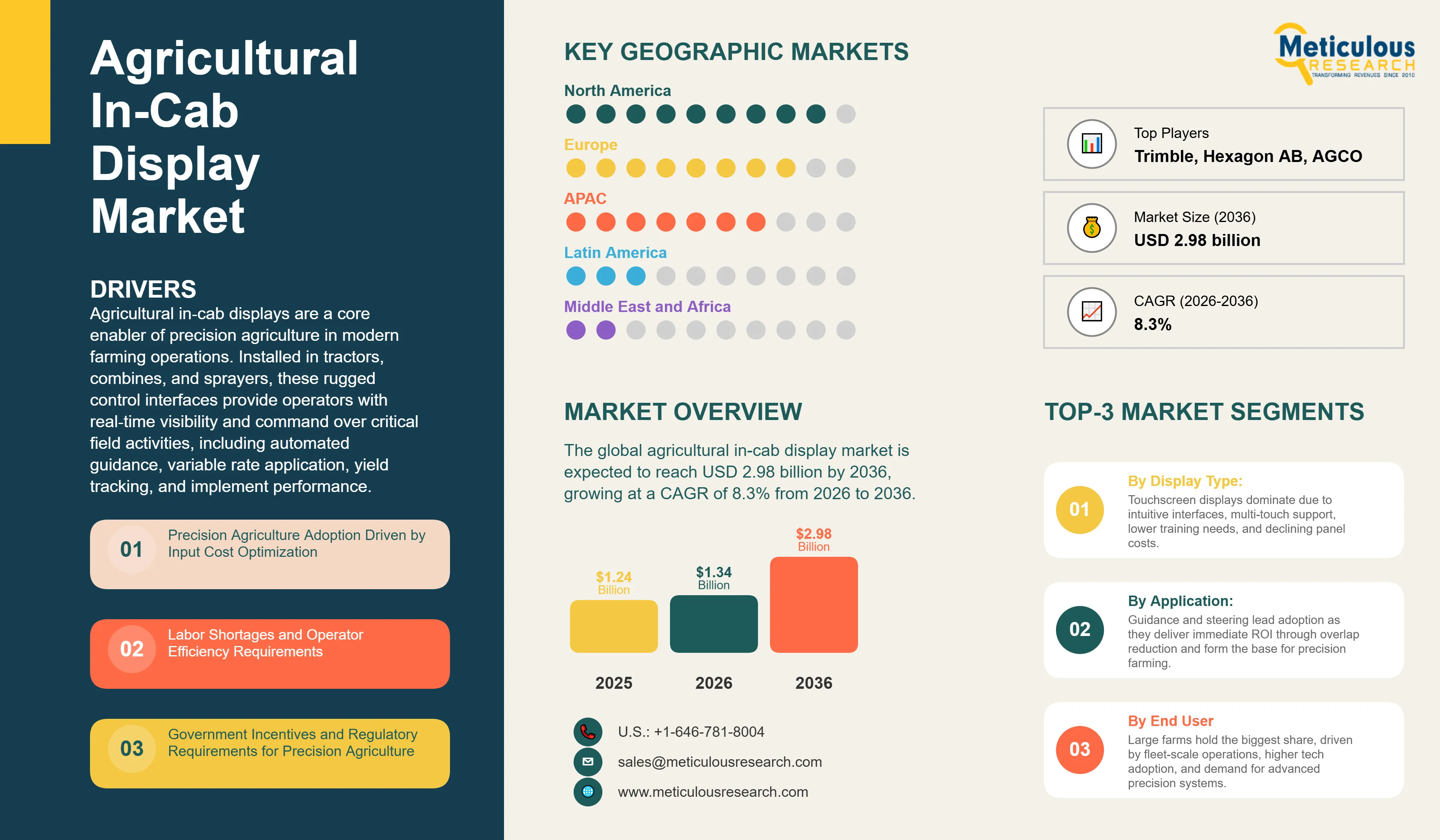Report ID: MRAGR - 1041642 Pages: 211 Jan-2026 Formats*: PDF Category: Agriculture Delivery: 24 to 72 Hours Download Free Sample ReportThe global agricultural in-cab display market is expected to reach USD 2.98 billion by 2036 from USD 1.34 billion in 2026, growing at a CAGR of 8.3% from 2026 to 2036.