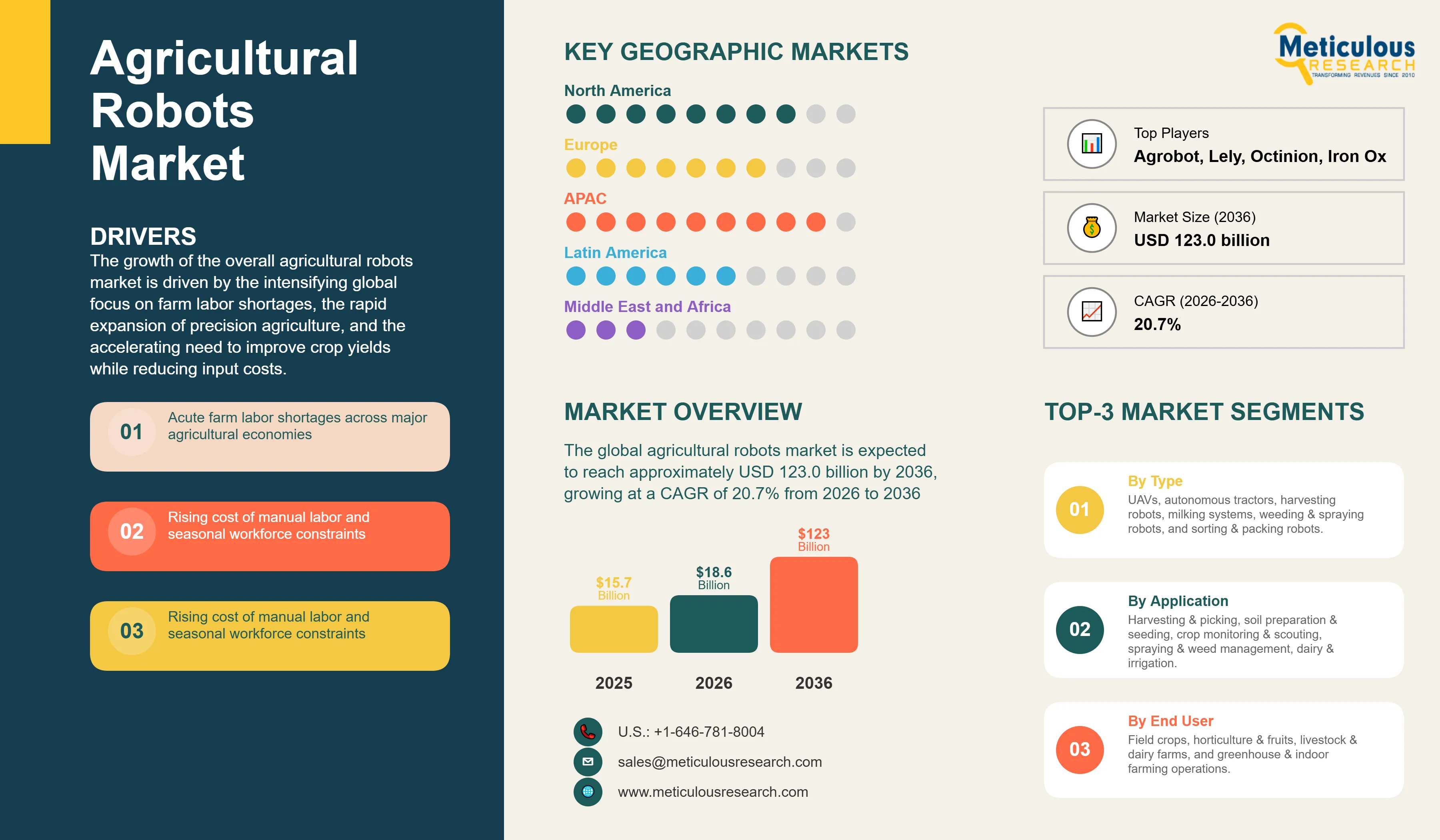 Report ID: MRAGR - 1041798 Pages: 268 Feb-2026 Formats*: PDF Category: Agriculture Delivery: 24 to 72 Hours Download Free Sample ReportThe global agricultural robots market was valued at USD 15.7 billion in 2025. The market is expected to reach approximately USD 123.0 billion by 2036 from USD 18.6 billion in 2026, growing at a CAGR of 20.7% from 2026 to 2036. The growth of the overall agricultural robots market is driven by the intensifying global focus on farm labor shortages, the rapid expansion of precision agriculture, and the accelerating need to improve crop yields while reducing input costs. As farm operators and agribusinesses seek to integrate greater automation and intelligence into their production cycles, agricultural robots have become essential for maintaining high-throughput field operations, food safety standards, and long-term farm profitability. The rapid adoption of autonomous field machinery, AI-enabled crop scouting platforms, and unmanned aerial vehicles continues to fuel significant growth of this market across all major geographic regions.