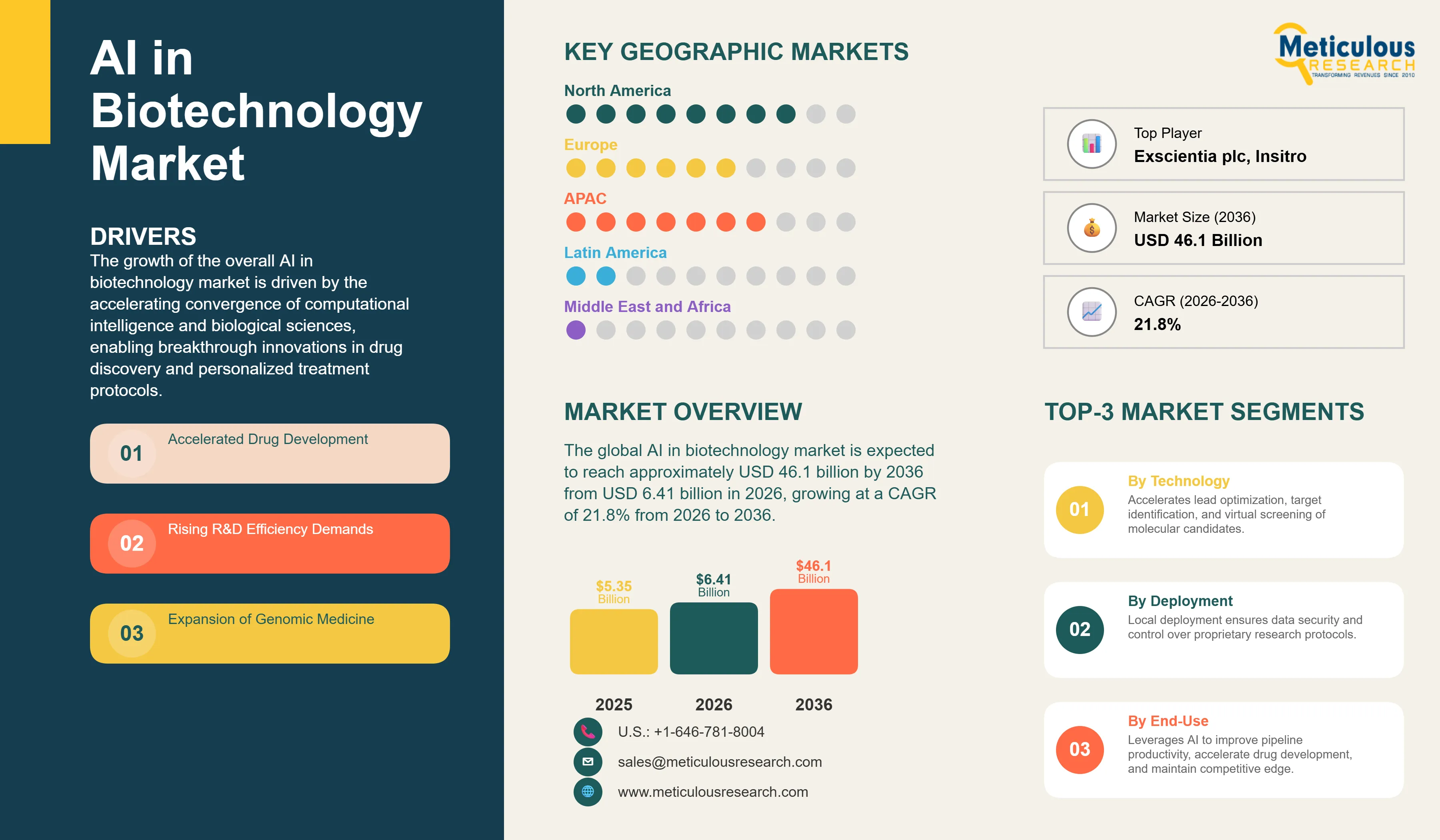 Report ID: MRHC - 1041787 Pages: 277 Feb-2026 Formats*: PDF Category: Healthcare Delivery: 24 to 72 Hours Download Free Sample ReportThe global AI in biotechnology market was valued at USD 5.35 billion in 2025. The market is expected to reach approximately USD 46.1 billion by 2036 from USD 6.41 billion in 2026, growing at a CAGR of 21.8% from 2026 to 2036. The growth of the overall AI in biotechnology market is driven by the accelerating convergence of computational intelligence and biological sciences, enabling breakthrough innovations in drug discovery and personalized treatment protocols. As pharmaceutical organizations seek to compress development timelines and enhance the precision of therapeutic interventions, AI-powered platforms have become essential for maintaining competitive advantage in biological research and clinical translation. The rapid expansion of genomic datasets and the increasing need for high-throughput screening in complex disease environments continue to fuel significant growth of this market across all major geographic regions.