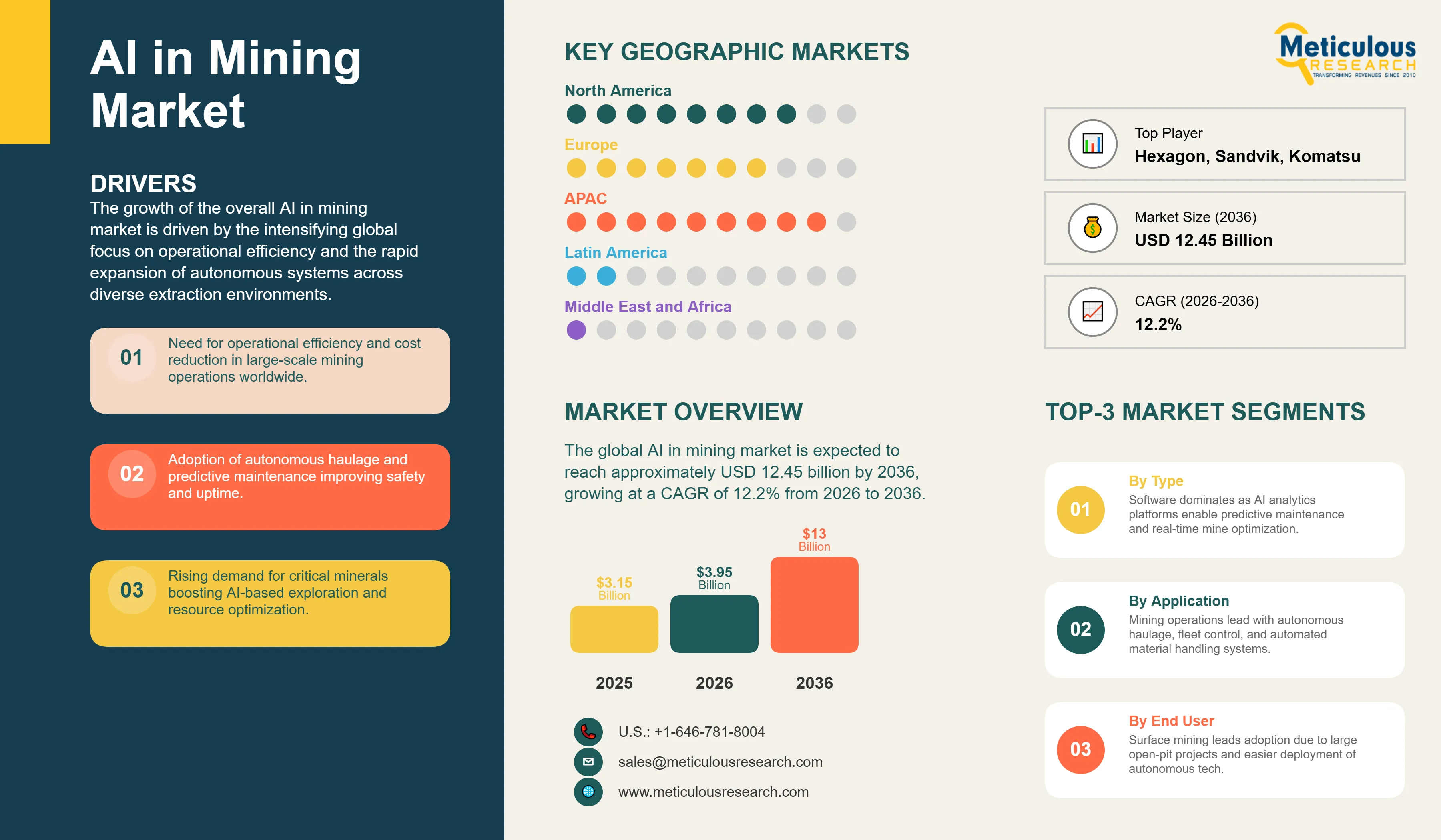 Report ID: MRICT - 1041769 Pages: 282 Feb-2026 Formats*: PDF Category: Information and Communications Technology Delivery: 24 to 72 Hours Download Free Sample ReportThe global AI in mining market was valued at USD 3.15 billion in 2025. The market is expected to reach approximately USD 12.45 billion by 2036 from USD 3.95 billion in 2026, growing at a CAGR of 12.2% from 2026 to 2036. The growth of the overall AI in mining market is driven by the intensifying global focus on operational efficiency and the rapid expansion of autonomous systems across diverse extraction environments. As mining enterprises seek to integrate more intelligence into their production frameworks and address the increasing demand for real-time resource optimization and worker safety, advanced AI platforms have become essential for maintaining structural integrity and instructional performance. The rapid expansion of AI-driven predictive maintenance and the increasing need for high-performance mineral processing and exploration continue to fuel significant growth of this market across all major geographic regions.