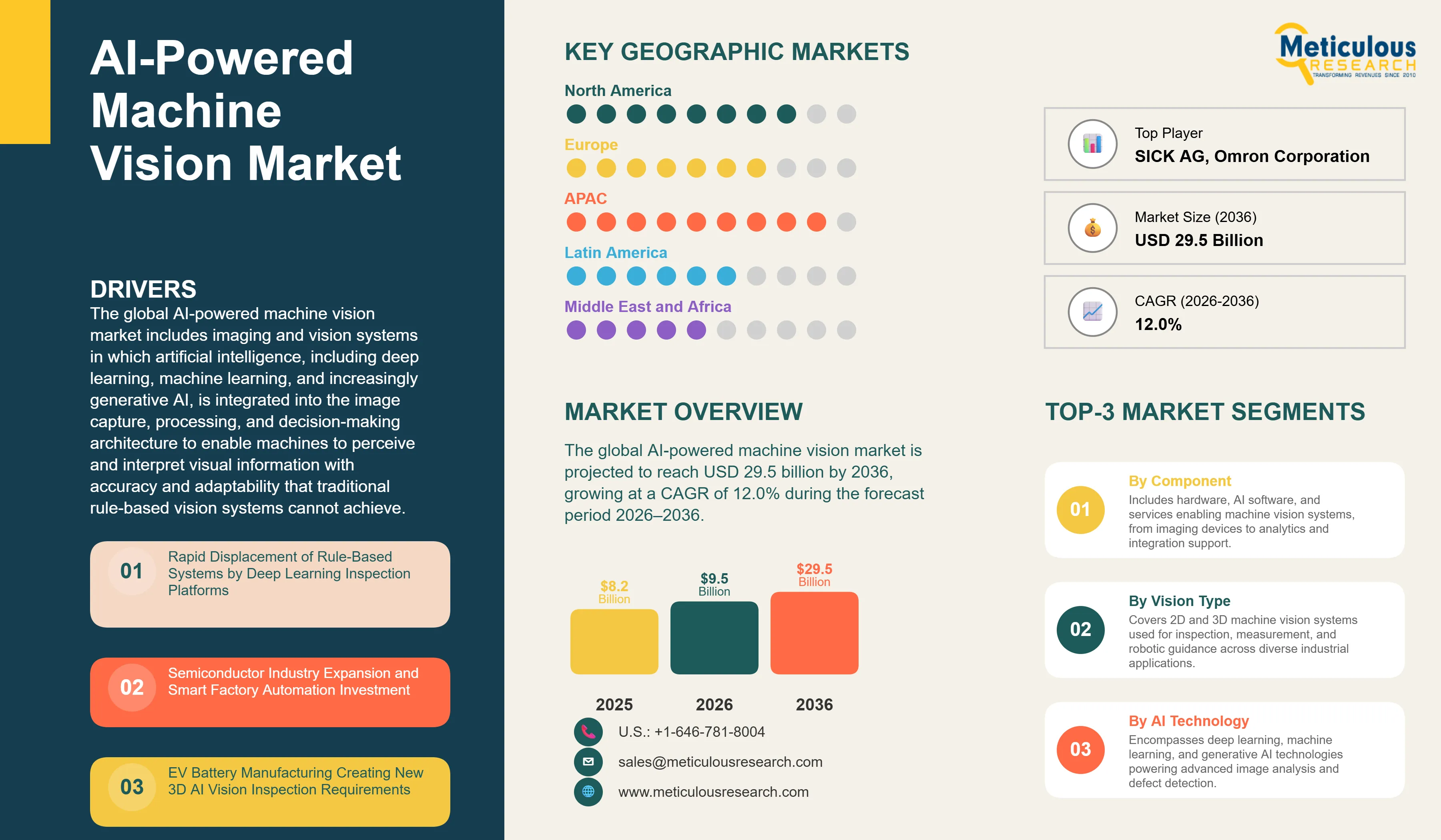 Report ID: MRSE - 1041928 Pages: 290 Apr-2026 Formats*: PDF Category: Semiconductor and Electronics Delivery: 24 to 72 Hours Download Free Sample ReportThe global AI-powered machine vision market was valued at USD 8.2 billion in 2025. The market is projected to reach USD 29.5 billion by 2036 from an estimated USD 9.5 billion in 2026, growing at a CAGR of 12.0% during the forecast period 2026–2036.