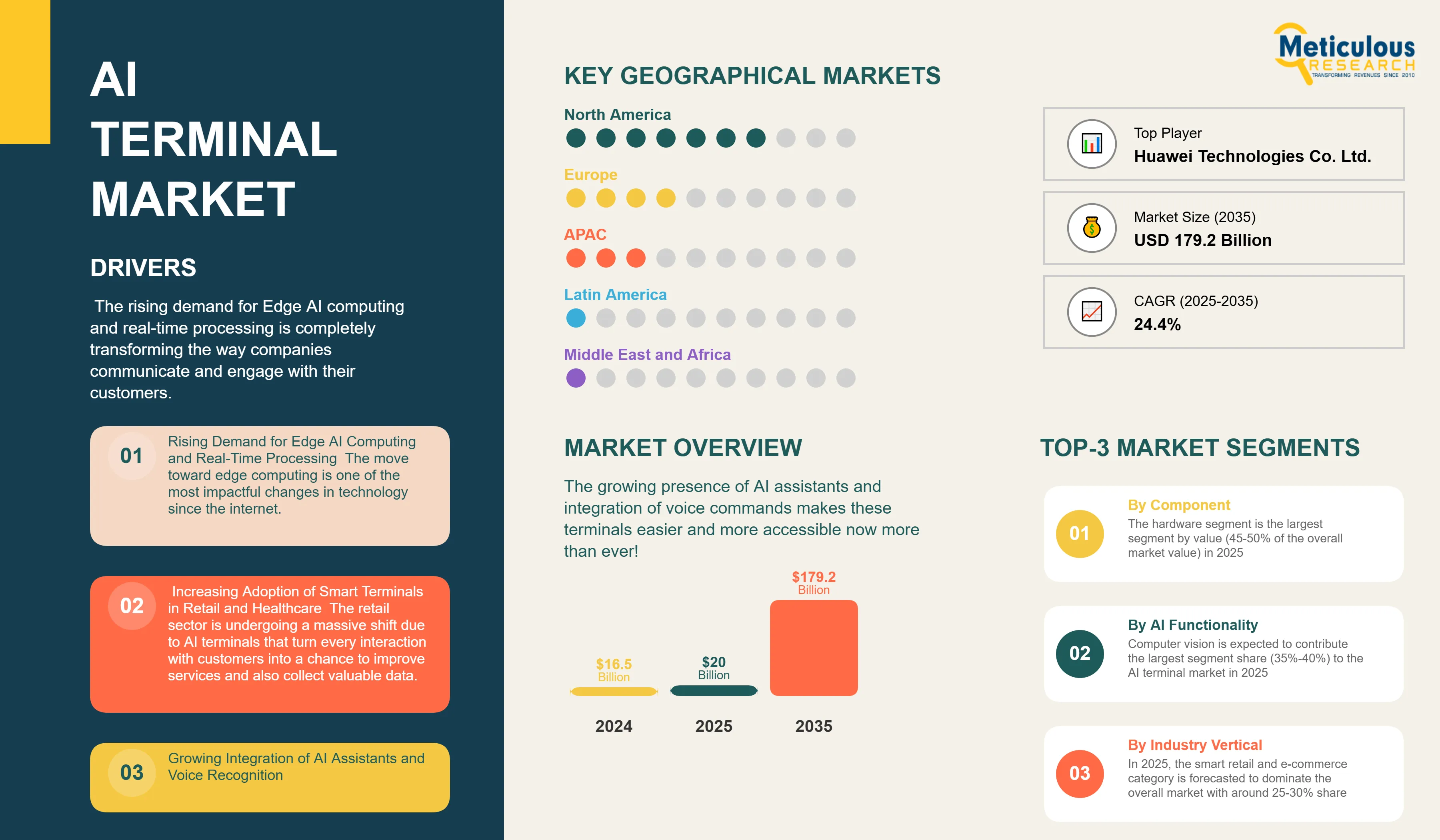 The AI terminal market is projected to reach USD 179.2 billion by 2035 from USD 20 billion in 2025, at a CAGR of 24.4% during the forecast period.