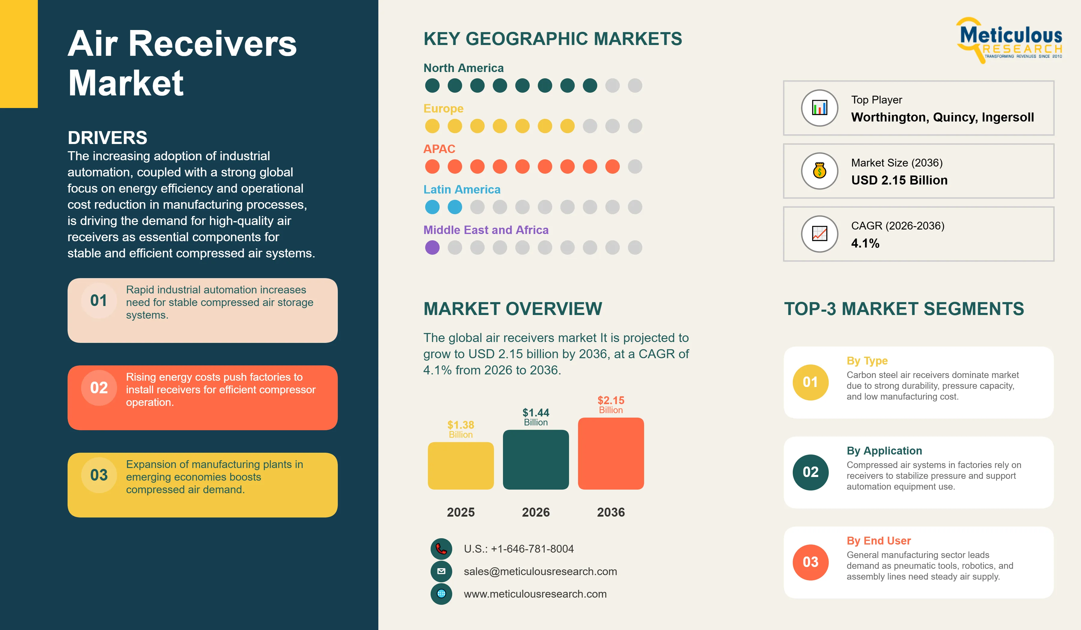 Air Receivers Market by Material (Carbon Steel, Stainless Steel), Orientation (Vertical, Horizontal), Pressure Rating (Low, Medium, High), End-User (Manufacturing, Automotive, Food & Beverage, Oil & Gas, Healthcare), and Geography – Global Forecast to 2036