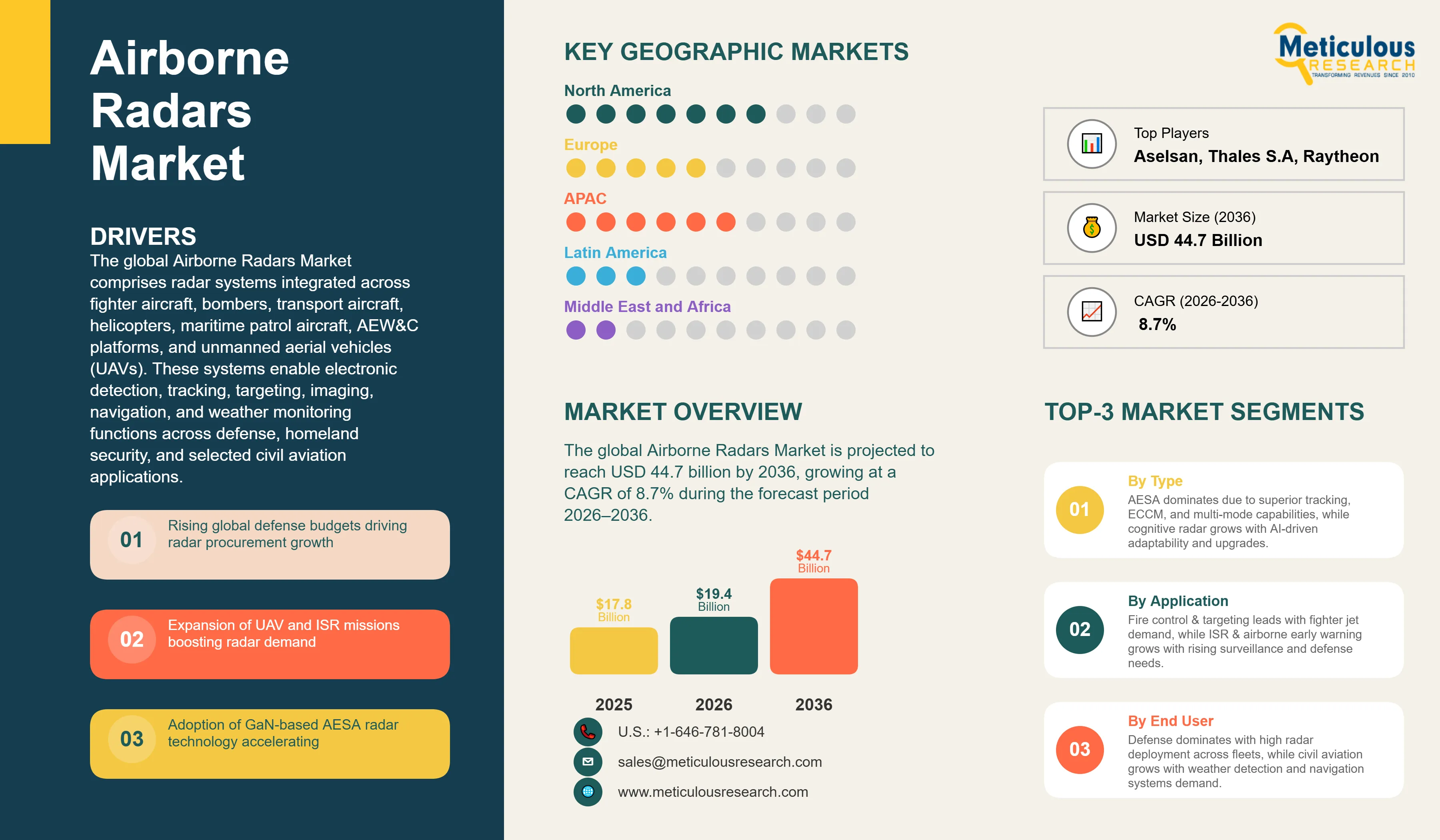 The global Airborne Radars Market comprises radar systems integrated across fighter aircraft, bombers, transport aircraft, helicopters, maritime patrol aircraft, AEW&C platforms, and unmanned aerial vehicles (UAVs). These systems enable electronic detection, tracking, targeting, imaging, navigation, and weather monitoring functions across defense, homeland security, and selected civil aviation applications.