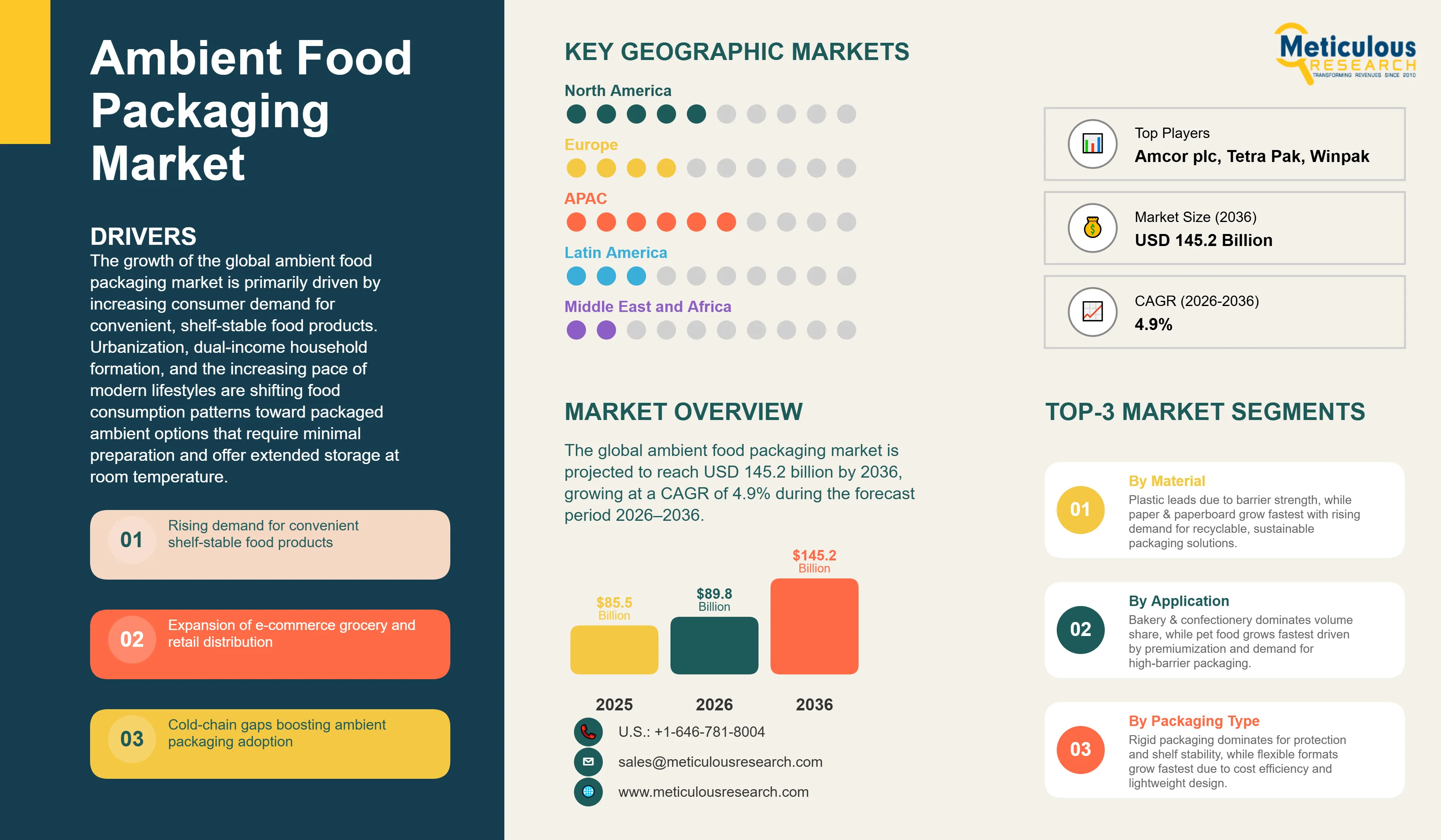 The growth of this market is primarily driven by increasing global demand for convenient, shelf-stable food products fueled by urbanization and busy consumer lifestyles; cold-chain infrastructure gaps in developing markets that make ambient packaging essential for safe food distribution; the rapid expansion of e-commerce grocery retail requiring robust ambient packaging; the premiumization of pet food and snack categories; and continuous technological advancement in barrier materials, aseptic processing, and active and intelligent packaging that extends shelf life and reduces food waste.