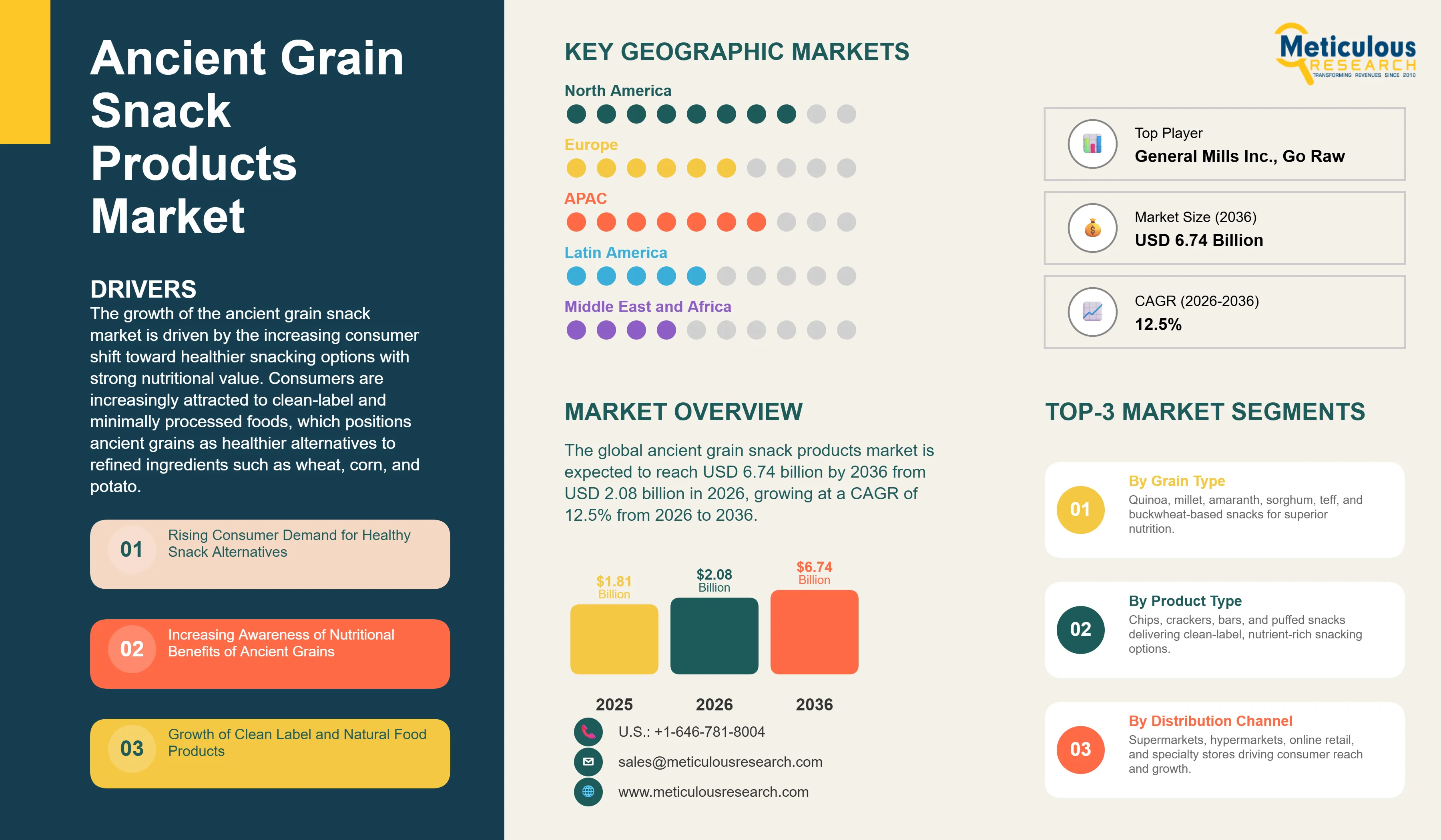 The ancient grain snack products market is a rapidly growing segment within the global better-for-you snacks industry, driven by increasing consumer demand for healthier, nutrient-rich snack options. Ancient grains such as quinoa, millet, amaranth, and teff are gaining popularity due to their high fiber, protein, and micronutrient content. As consumers increasingly seek snacks that provide both taste and nutritional benefits, ancient grain snacks are becoming positioned at the intersection of the snack and functional food markets.