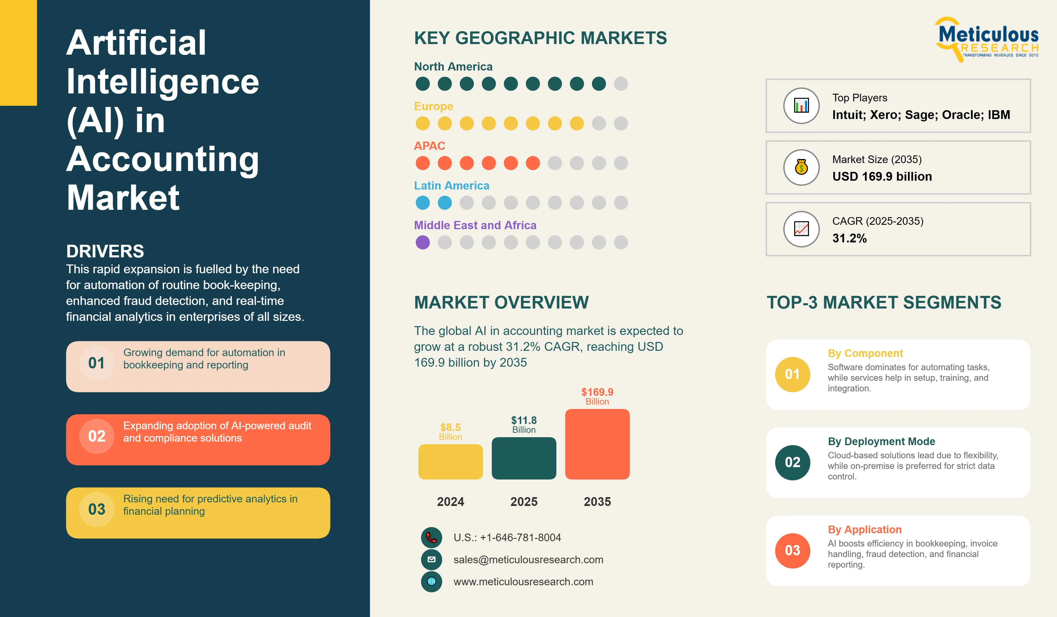 Intuit; Xero; Sage; Oracle; IBM; Zoho; BlackLine; KPMG; Deloitte; PwC; EY; Workday; Botkeeper; MindBridge AI; AppZen; Dext Software; Vic.ai; HyperScience; SMACC among others are the major companies operating in the AI in Accounting Market.