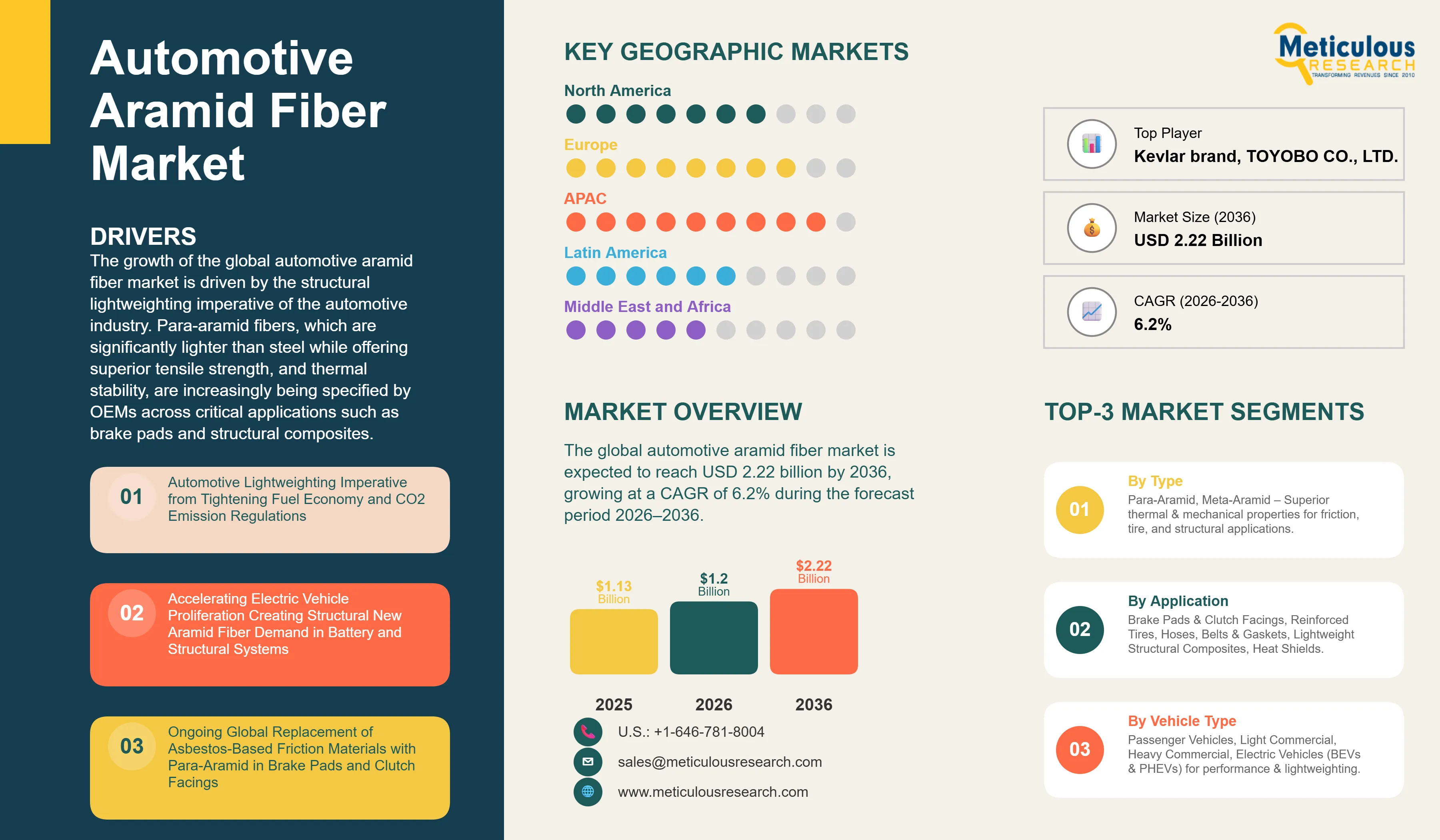 Automotive Aramid Fiber Market Size, Share & Trends Analysis by Type (Para-Aramid, Meta-Aramid), Application (Brake Pads & Clutch Facings, Reinforced Tires, Hoses, Belts & Gaskets), Vehicle Type (Passenger Vehicles, Commercial Vehicles, EVs), and Geography — Global Opportunity Analysis & Industry Forecast (2026–2036)