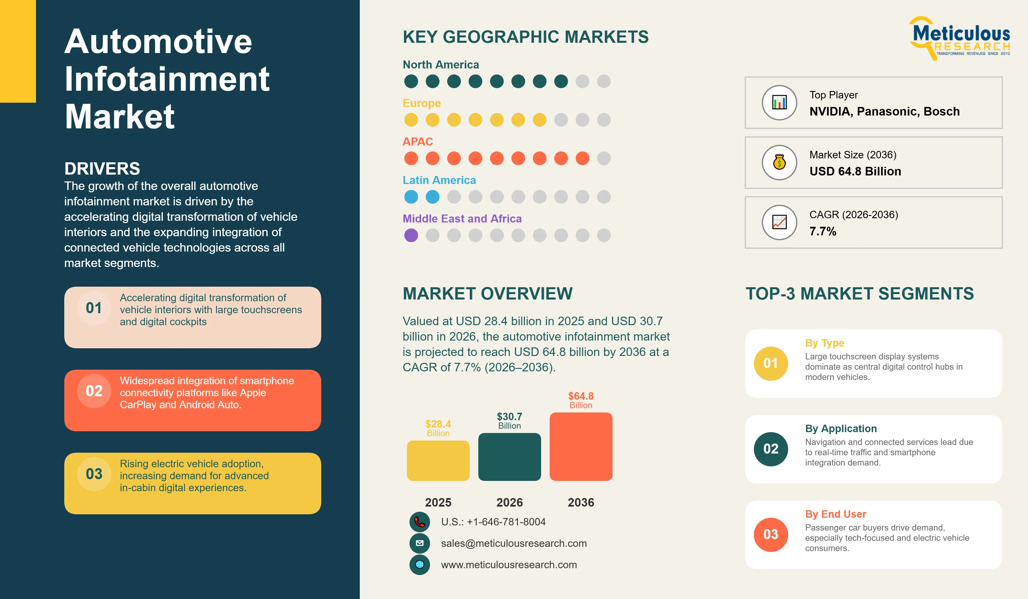 Report ID: MRICT - 1041723 Pages: 277 Feb-2026 Formats*: PDF Category: Information and Communications Technology Delivery: 24 to 72 Hours Download Free Sample ReportThe global automotive infotainment market was valued at USD 28.4 billion in 2025. The market is expected to reach approximately USD 64.8 billion by 2036 from USD 30.7 billion in 2026, growing at a CAGR of 7.7% from 2026 to 2036. The growth of the overall automotive infotainment market is driven by the accelerating digital transformation of vehicle interiors and the expanding integration of connected vehicle technologies across all market segments. As automotive manufacturers increasingly recognize infotainment systems as critical differentiators in competitive markets, advanced display technologies, software-defined architectures, and seamless smartphone connectivity have become essential features across vehicle categories from entry-level to premium segments. The rapid expansion of electric vehicle adoption and the evolving expectations of digitally-native consumer demographics continue to fuel significant investments in next-generation infotainment platforms across all major automotive markets.