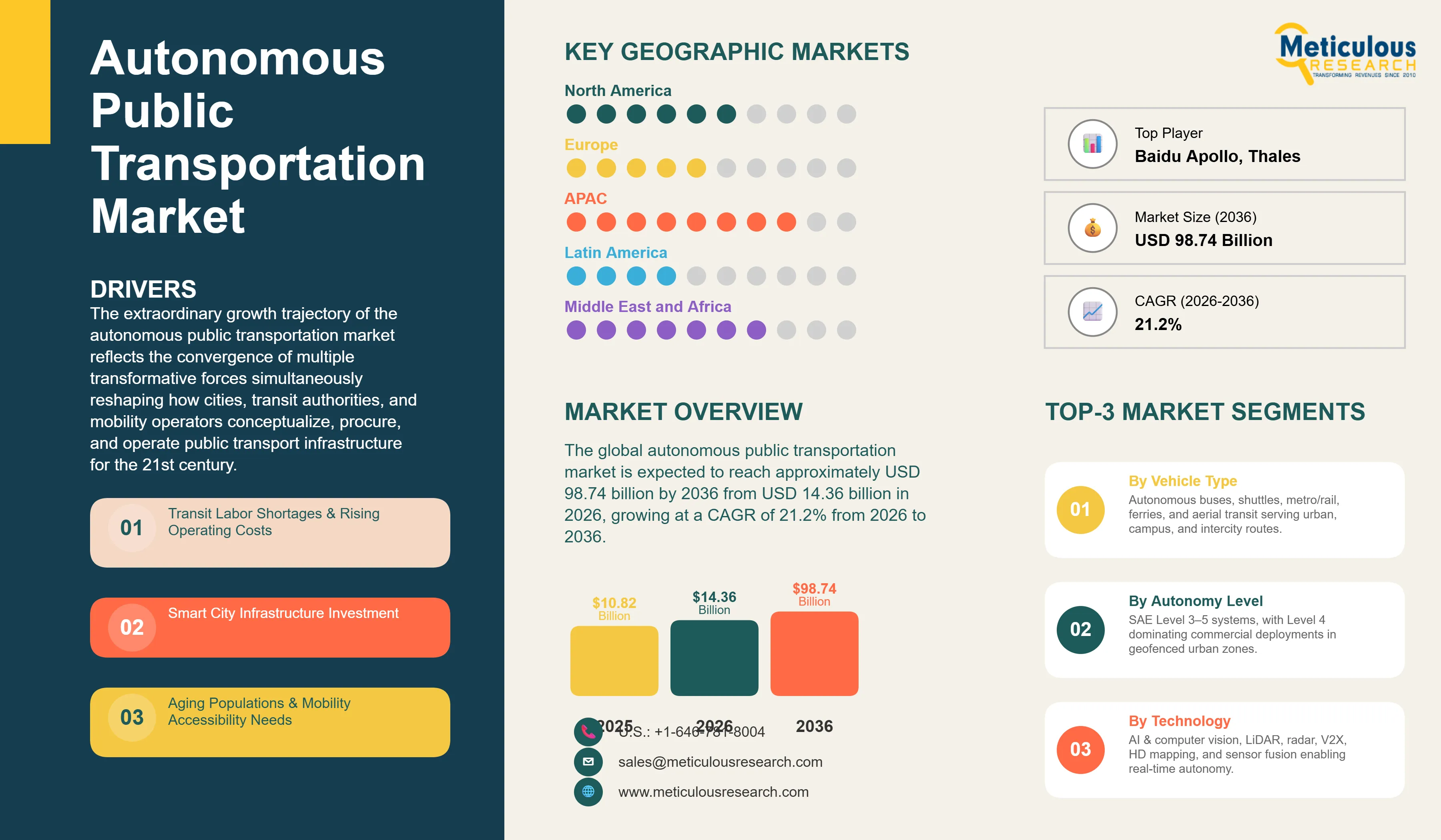 Report ID: MRSE - 1041827 Pages: 310 Mar-2026 Formats*: PDF Category: Semiconductor and Electronics Delivery: 24 to 72 Hours Download Free Sample ReportThe global autonomous public transportation market was valued at USD 10.82 billion in 2025. The market is expected to reach approximately USD 98.74 billion by 2036 from USD 14.36 billion in 2026, growing at a CAGR of 21.2% from 2026 to 2036. The extraordinary growth trajectory of the autonomous public transportation market reflects the convergence of multiple transformative forces simultaneously reshaping how cities, transit authorities, and mobility operators conceptualize, procure, and operate public transport infrastructure for the 21st century. Advances in artificial intelligence, computer vision, LiDAR sensor technology, and vehicle-to-everything communication systems have reached commercial maturity thresholds enabling deployment of driverless transit vehicles in increasingly complex real-world environments, while mounting structural pressures on public transit systems — including persistent driver shortages, escalating labor costs that consume 60-75% of typical transit agency operating budgets, and demographic shifts creating demand for mobility solutions serving aging populations with reduced personal vehicle capability — are creating urgent economic and social imperatives for autonomous transit adoption. The successful commercial deployments of autonomous shuttle services, driverless metro systems, and self-driving bus pilots across Singapore, Helsinki, Las Vegas, and Shenzhen demonstrate proven operational concepts that are now scaling from pilot programs into systematic network deployment programs attracting multi-billion dollar investment from both public transit authorities and private mobility platforms recognizing autonomous public transit as a foundational urban infrastructure component for the smart city era.