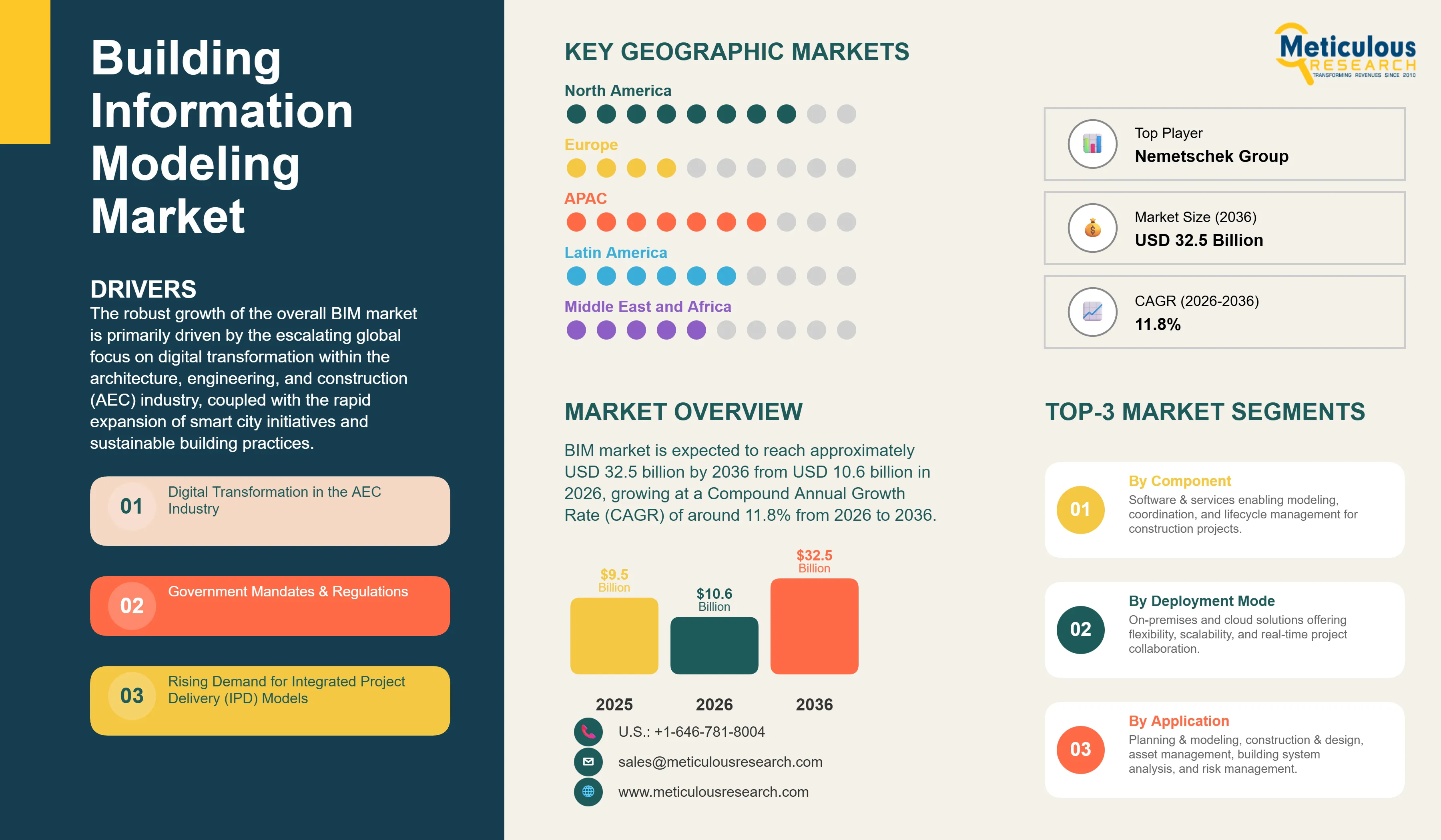 Report ID: MRICT - 1041727 Pages: 285 Feb-2026 Formats*: PDF Category: Information and Communications Technology Delivery: 24 to 72 Hours Download Free Sample ReportThe global Building Information Modeling (BIM) market was valued at approximately USD 9.5 billion in 2025. The market is expected to reach approximately USD 32.5 billion by 2036 from USD 10.6 billion in 2026, growing at a Compound Annual Growth Rate (CAGR) of around 11.8% from 2026 to 2036. The robust growth of the overall BIM market is primarily driven by the escalating global focus on digital transformation within the architecture, engineering, and construction (AEC) industry, coupled with the rapid expansion of smart city initiatives and sustainable building practices. As industry stakeholders increasingly seek to integrate advanced digital workflows and enhance project collaboration, BIM solutions have become indispensable for optimizing design, construction, and operational phases of building and infrastructure projects. The rapid evolution of cloud-based platforms and the increasing demand for integrated project delivery (IPD) models continue to fuel significant market expansion across all major geographic regions.