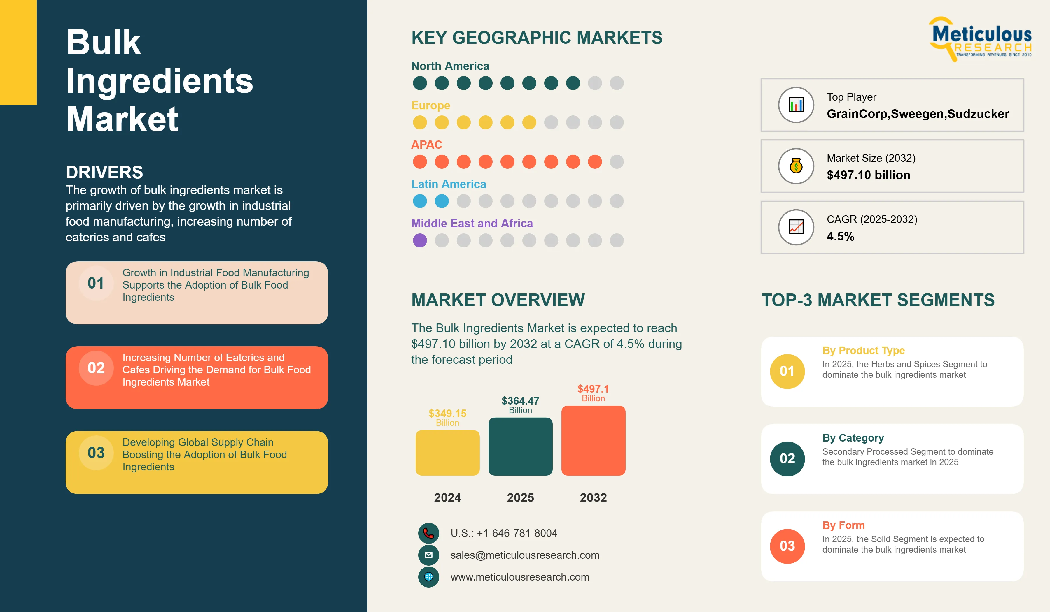Bulk Ingredients Market Size, Share, Forecast, & Trends Analysis by Product Type (Herbs & Spices, Nuts, Oilseeds, Sugar & Sweeteners, Edible Oil), Category (Secondary, Primary), Form (Solid, Liquid), Application (Food, Beverages) - Global Forecast to 2032