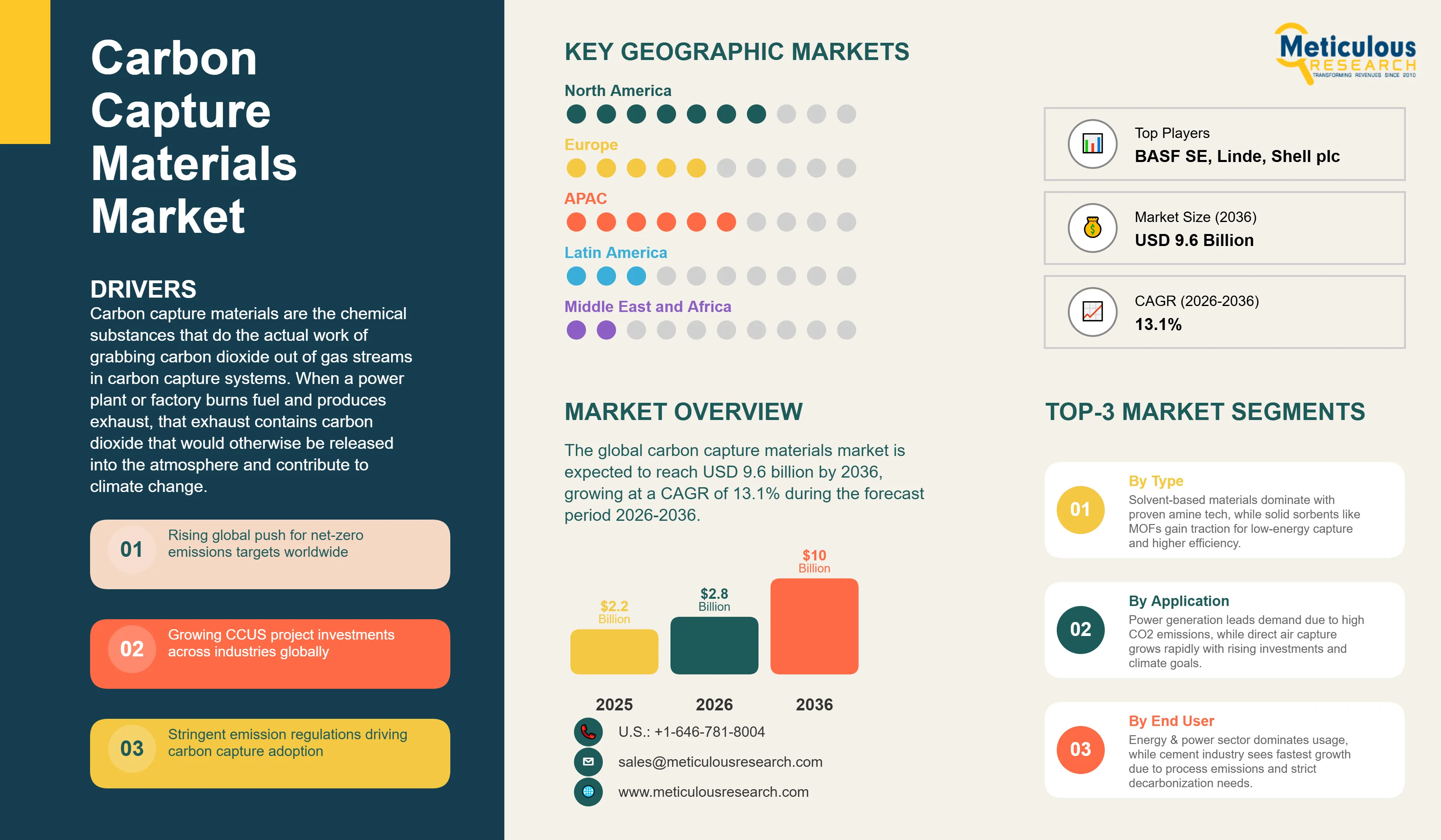 The market is primarily driven by the accelerating global commitment to net-zero emissions creating regulatory and financial pressure on industrial sectors to adopt carbon capture as a necessary decarbonization tool, and by the transformative impact of the U.S. Inflation Reduction Act's carbon capture tax credits, which have made a very large number of previously uneconomical carbon capture projects financially viable and generated a wave of new project activity that is creating growing demand for carbon capture materials.