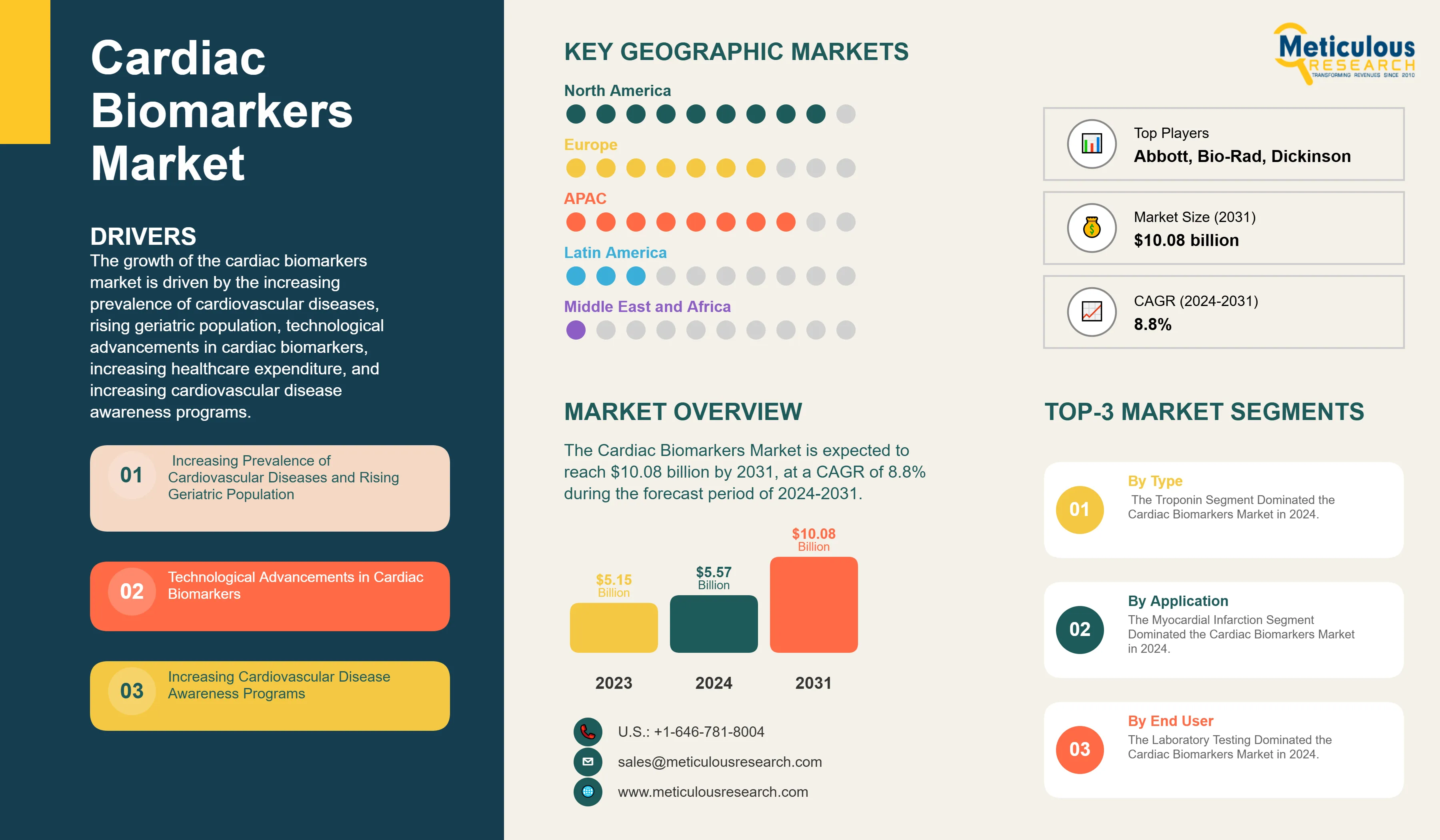 Cardiac Biomarkers Market Size, Share, Forecast, & Trends Analysis by Type (Troponin, CK-MB, Myoglobin, BNP), Application (Myocardial Infarction, Congestive Heart Failure), and End User (Laboratory Testing, POC Testing ) - Global Forecast to 2031
