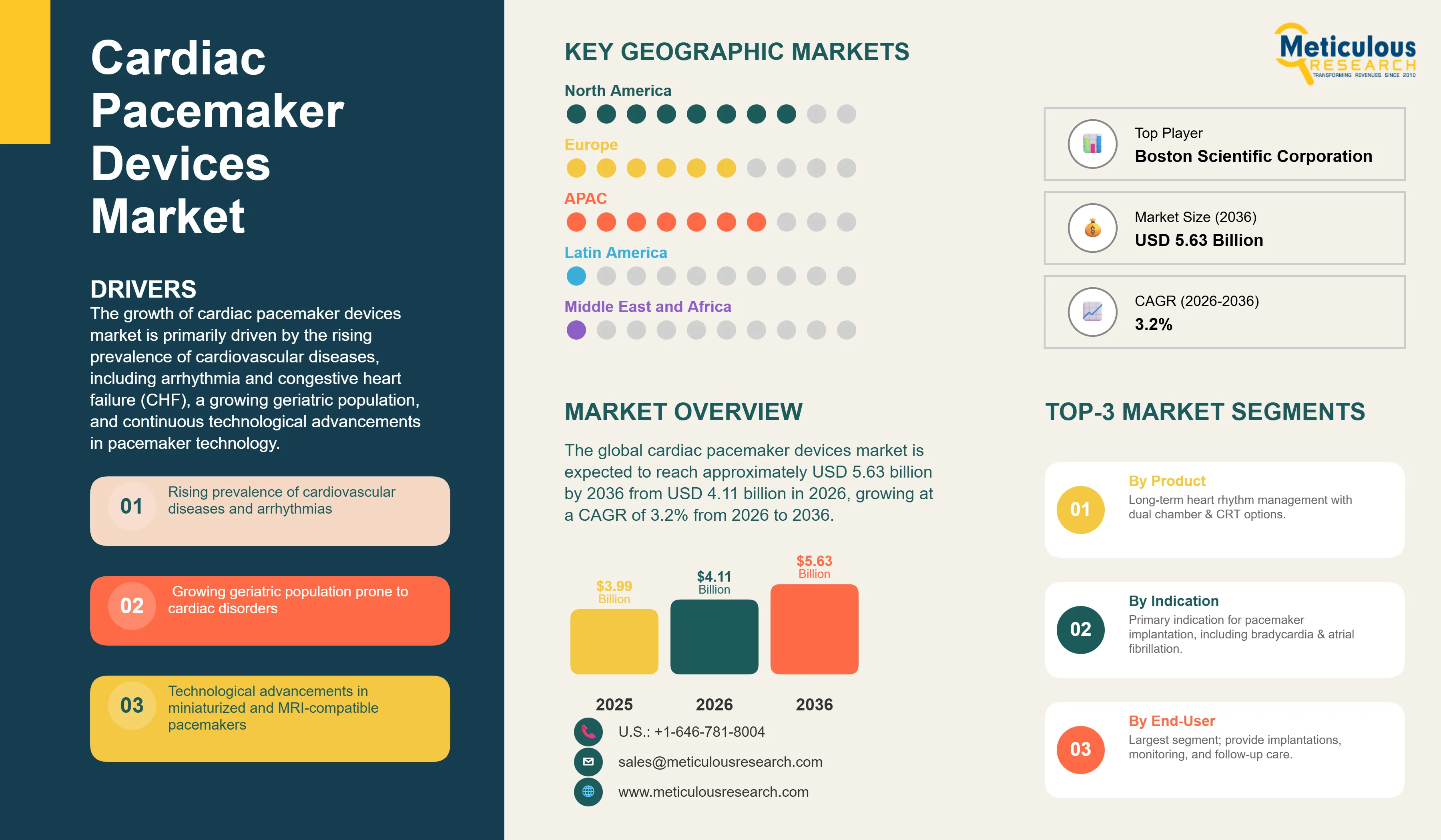 Report ID: MRHC - 10464 Pages: 200 Feb-2026 Formats*: PDF Category: Healthcare Delivery: 24 to 48 Hours Download Free Sample ReportThe global cardiac pacemaker devices market was valued at approximately USD 3.99 billion in 2025. This market is expected to reach approximately USD 5.63 billion by 2036 from USD 4.11 billion in 2026, growing at a CAGR of 3.2% from 2026 to 2036. The growth of this market is primarily driven by the rising prevalence of cardiovascular diseases, including arrhythmia and congestive heart failure (CHF), a growing geriatric population, and continuous technological advancements in pacemaker technology. For instance, the development of leadless pacemakers and devices with remote monitoring capabilities has significantly improved patient outcomes and expanded the market potential.