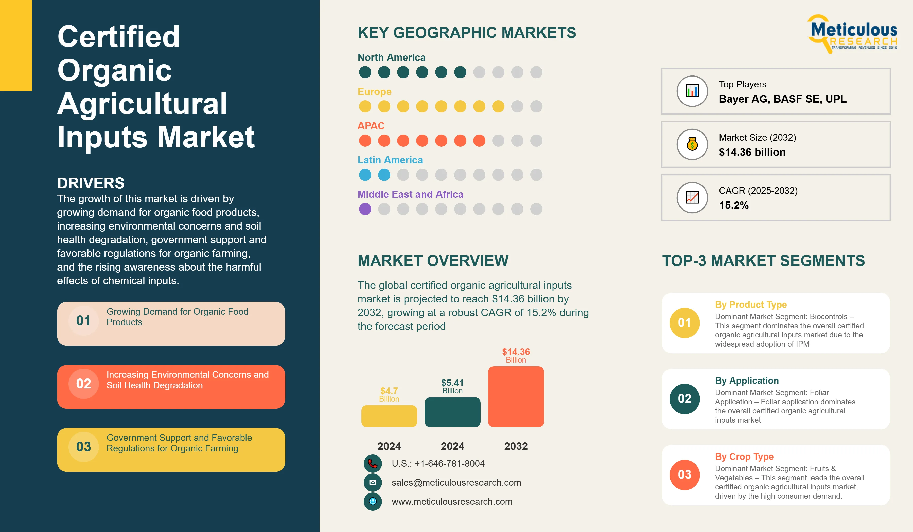 Certified Organic Agricultural Inputs Market Size, Share, Forecast, & Trends Analysis by Product Type (Biocontrols, Biostimulants, Biofertilizers, Co-formulants), Formulation (Liquid, Dry), Application Method (Foliar, Soil, Seed Treatment), Crop Type (Fruits & Vegetables, Cereals & Grains), Geography (Europe, North America, Asia-Pacific) – Global Forecast to 2032