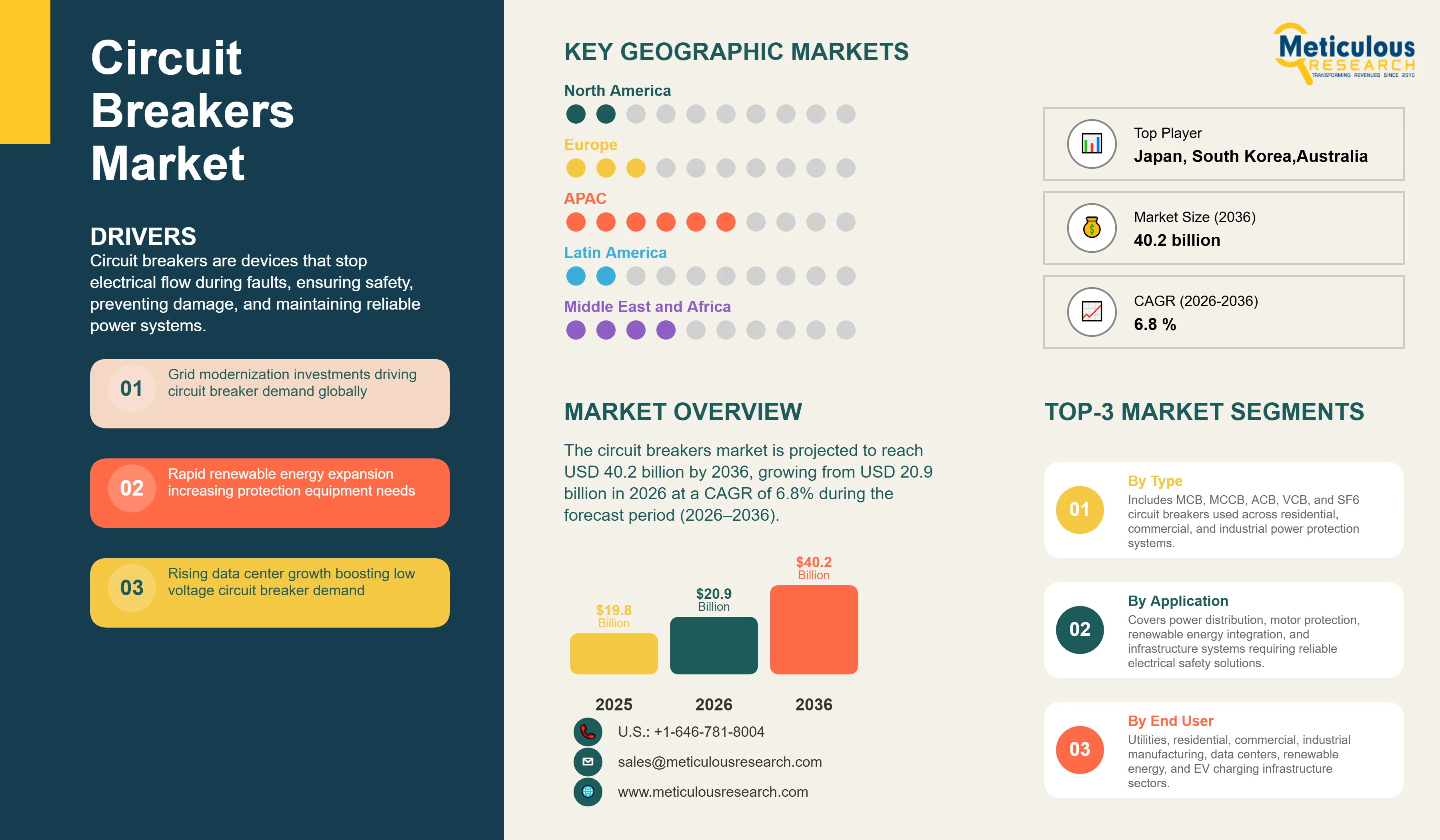 he global circuit breakers market size was valued at USD 20.9 billion in 2026 and is projected to reach USD 40.2 billion by 2036, growing at a CAGR of 6.8%.