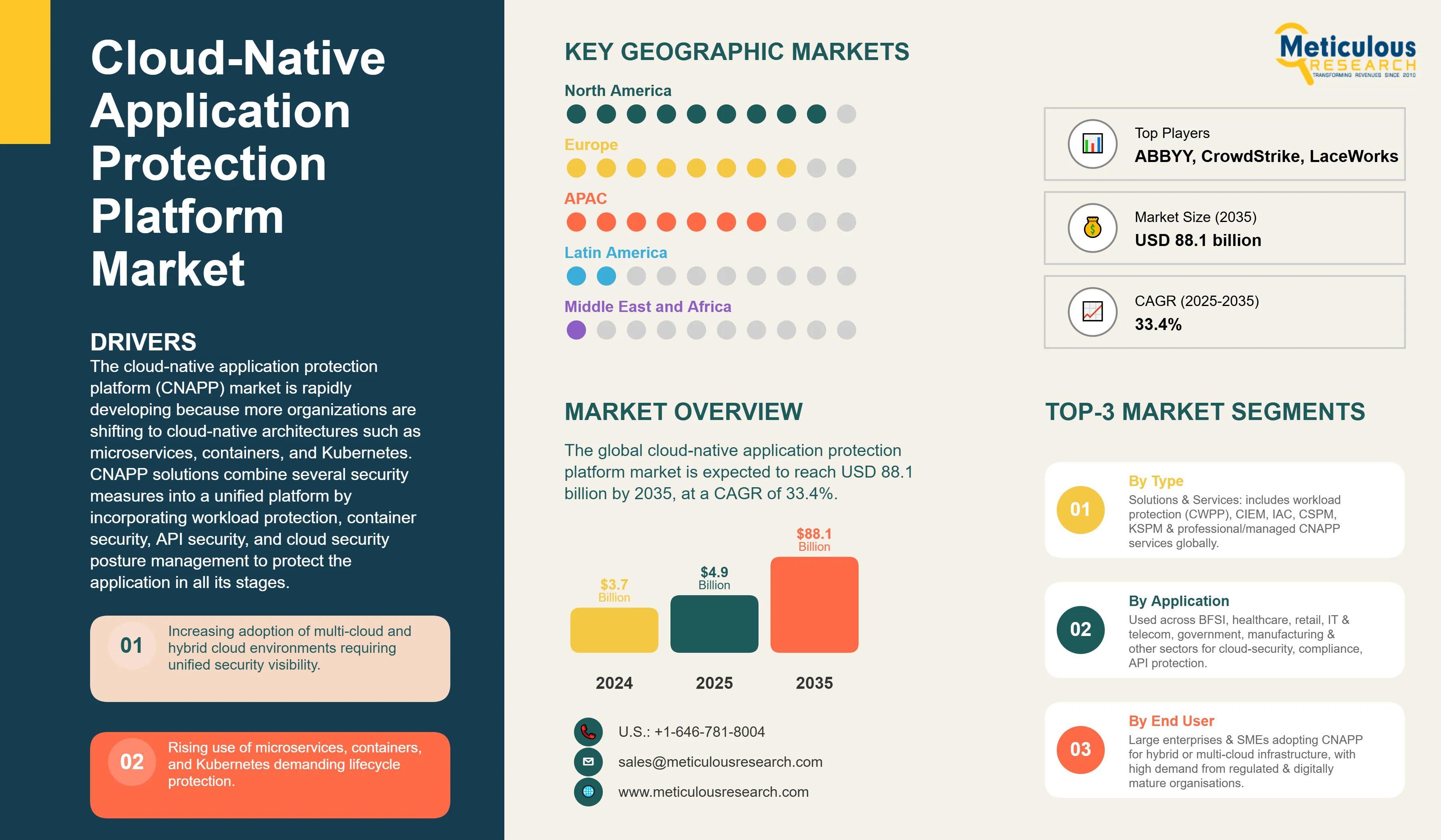 The Cloud-native Application Protection Platform Market size is estimated to be USD 4.9 billion in 2025 and grow at a CAGR of 33.4% to reach USD 88.1 billion by 2035.