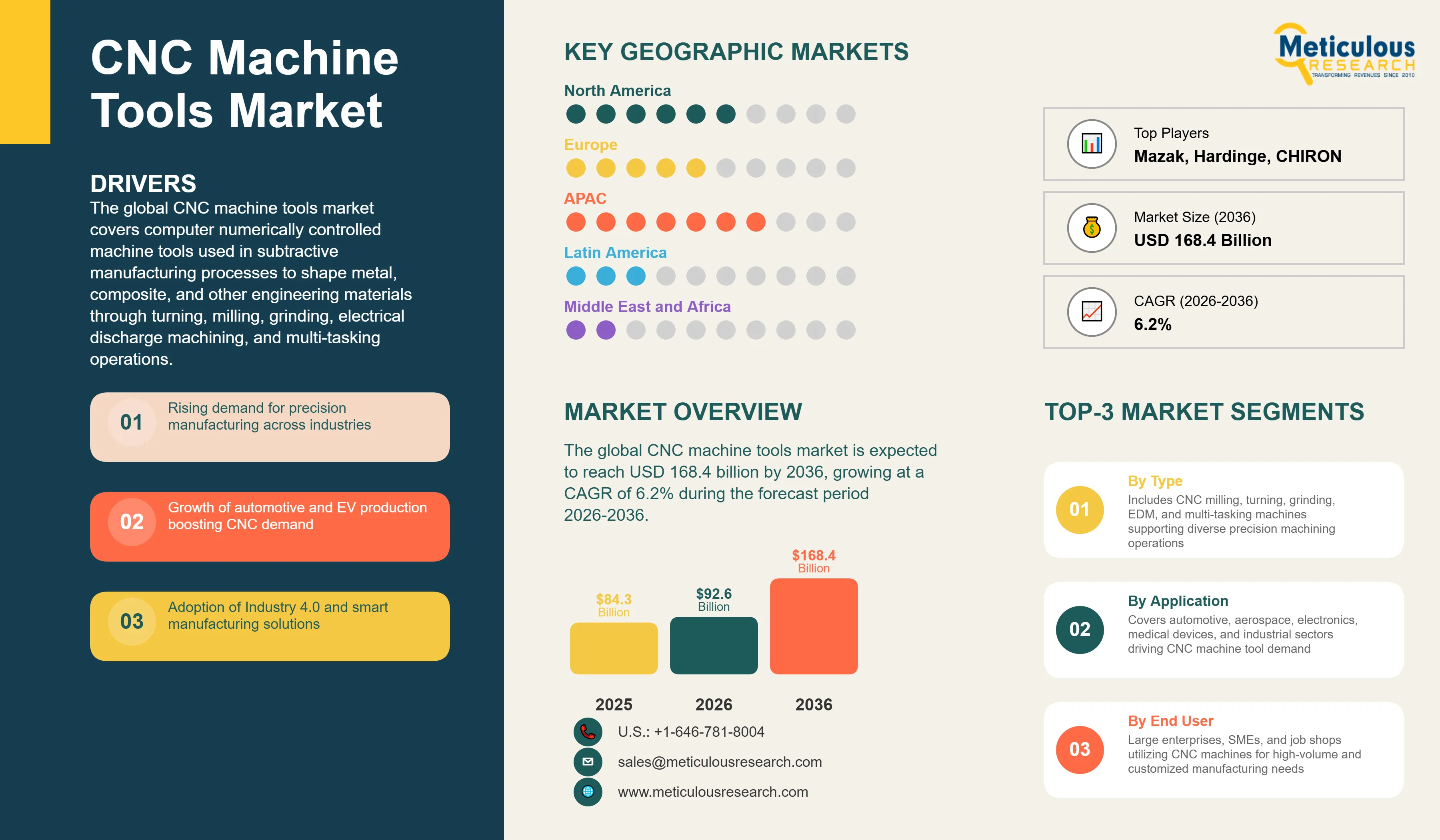 The global CNC machine tools market is expected to reach USD 168.4 billion by 2036 from an estimated USD 92.6 billion in 2026, at a CAGR of 6.2% during the forecast period 2026-2036.