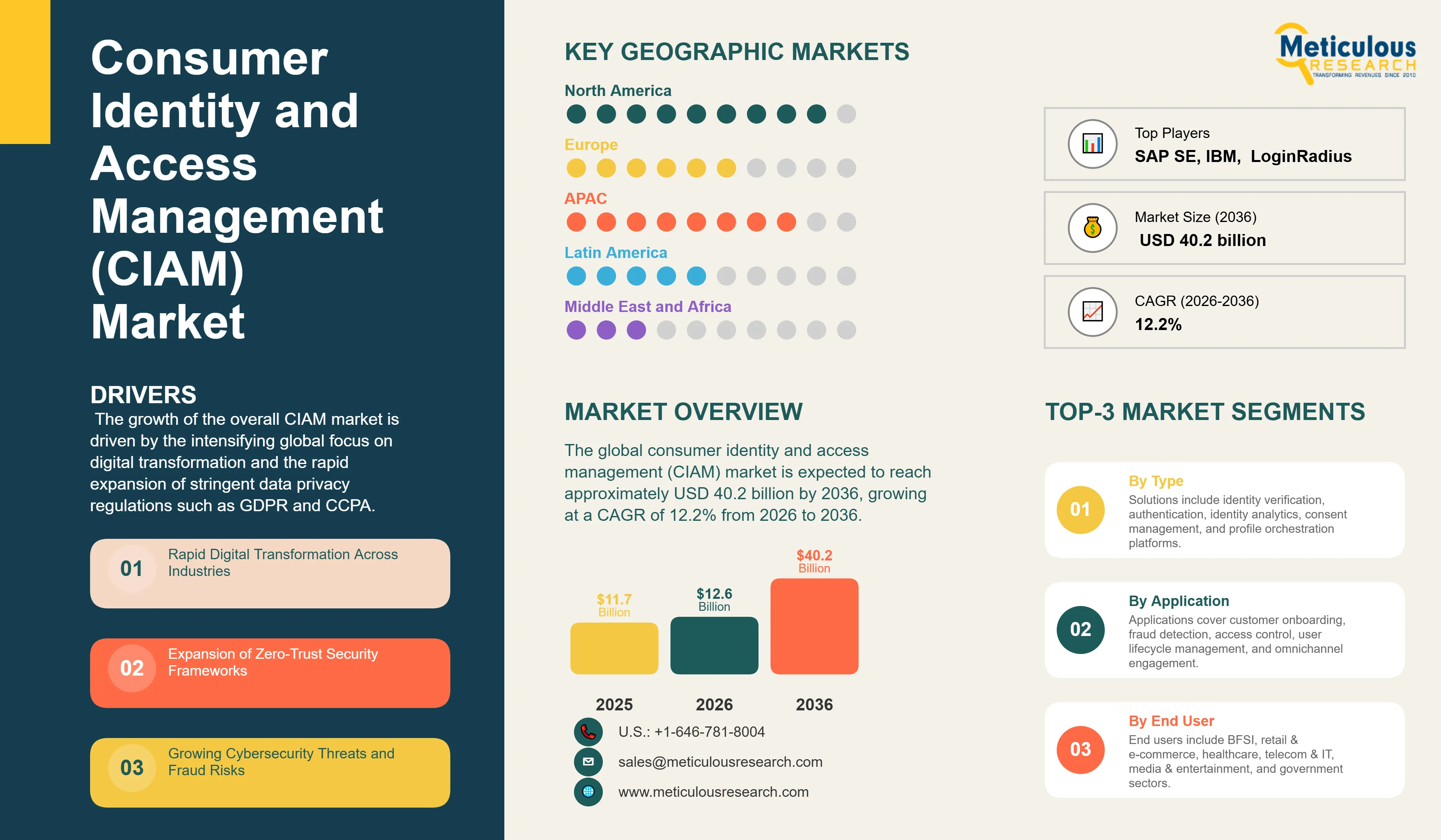 Report ID: MRICT - 1041753 Pages: 278 Feb-2026 Formats*: PDF Category: Information and Communications Technology Delivery: 24 to 72 Hours Download Free Sample ReportThe global consumer identity and access management (CIAM) market was valued at USD 11.7 billion in 2025. The market is expected to reach approximately USD 40.2 billion by 2036 from USD 12.6 billion in 2026, growing at a CAGR of 12.2% from 2026 to 2036. The growth of the overall CIAM market is driven by the intensifying global focus on digital transformation and the rapid expansion of stringent data privacy regulations such as GDPR and CCPA. As organizations seek to integrate more functionality into customer engagement and security management systems, CIAM infrastructure has become essential for maintaining high-performance user experiences and operational reliability. The rapid expansion of zero-trust initiatives and the increasing need for high-reliability protection in retail and financial complexes continue to fuel significant growth of this market across all major geographic regions.