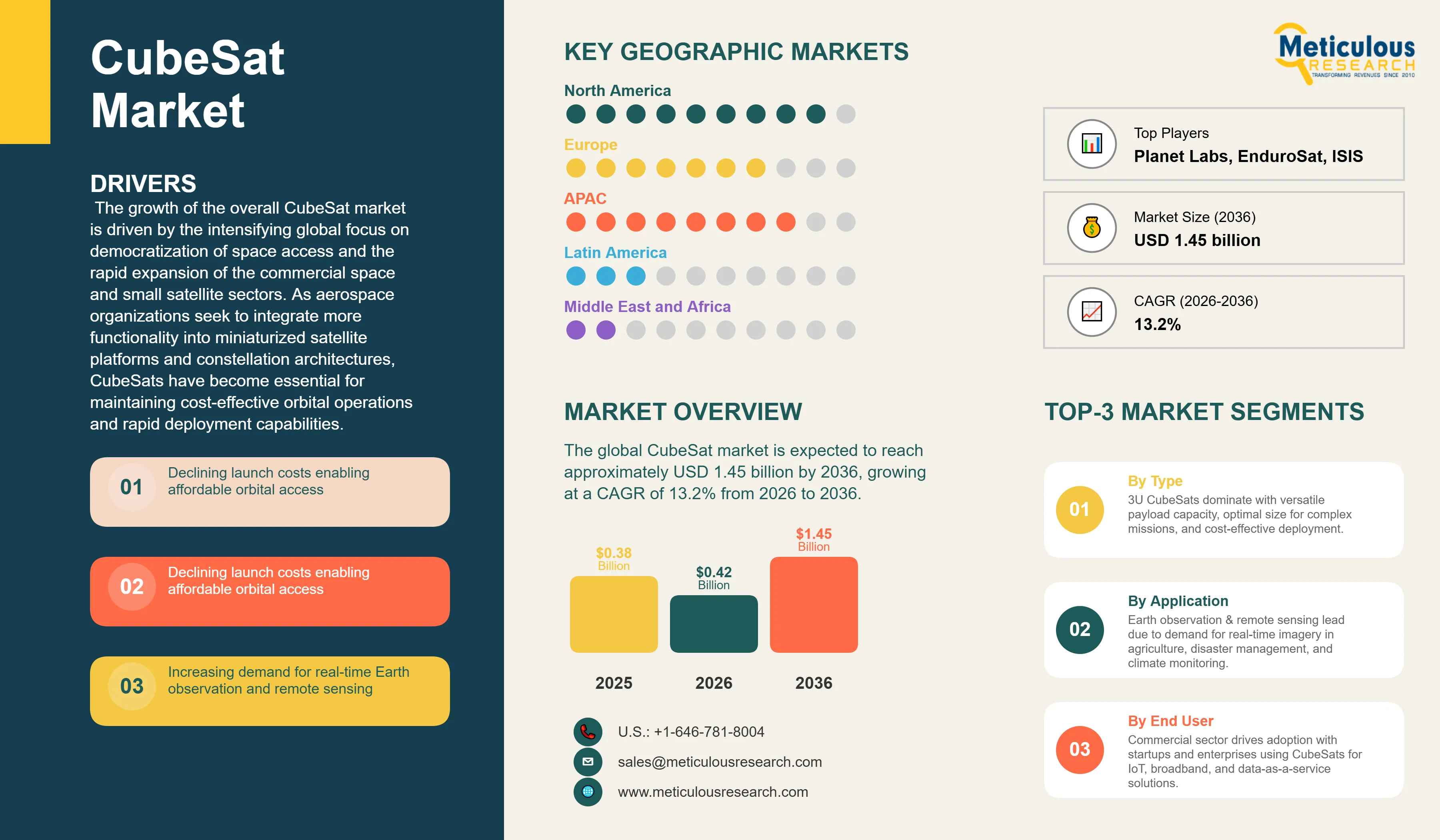 CubeSat Market by Type (1U, 2U, 3U, 6U, 12U and Above), Application (Earth Observation & Remote Sensing, Communication, Technology Demonstration, Scientific Research), End-User (Commercial, Government & Military, Academic & Research), and Orbit Type (Low Earth Orbit, Medium Earth Orbit, Geostationary Orbit) -- Global Forecast to 2036