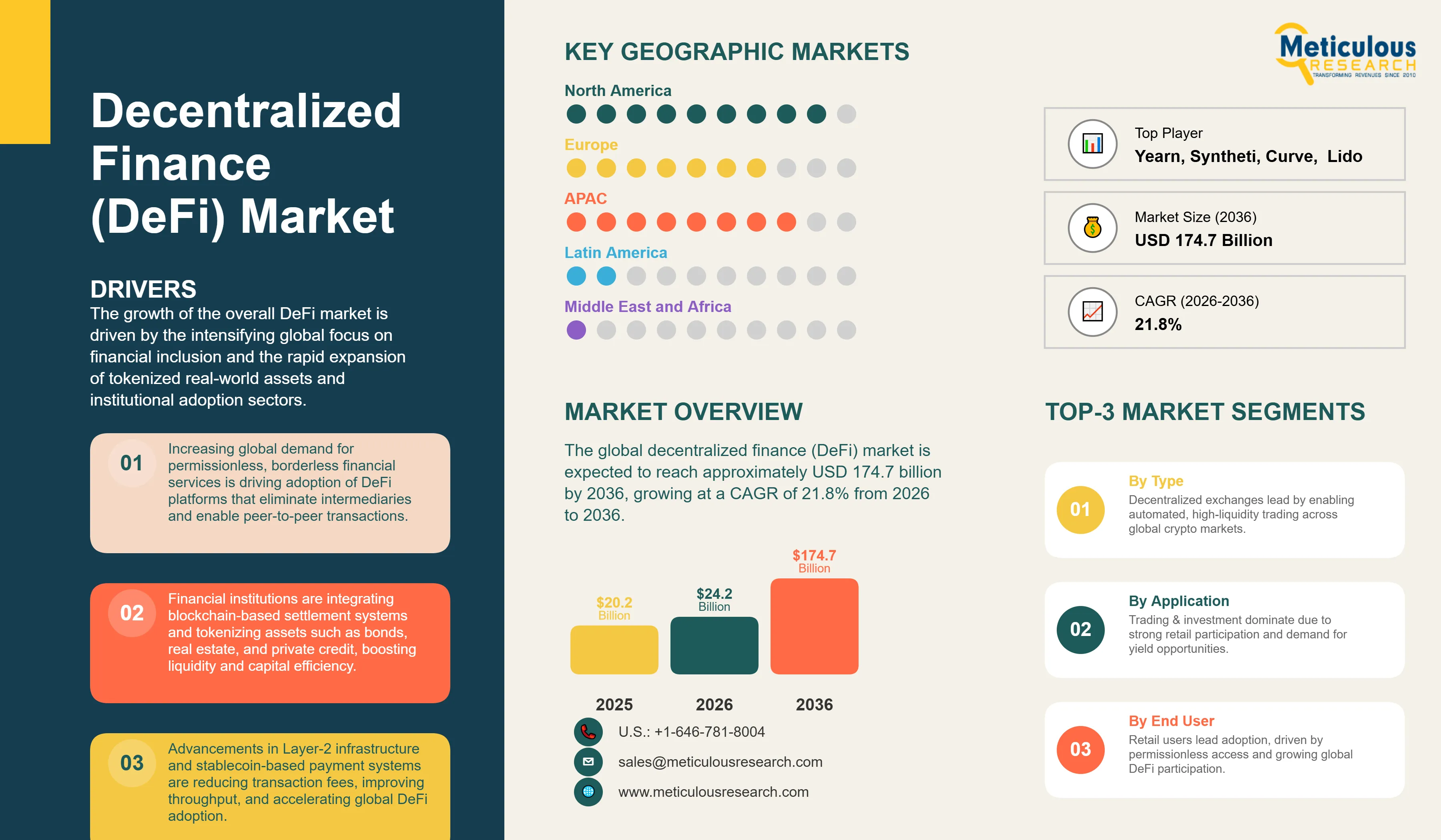 Report ID: MROTH - 1041732 Pages: 182 Feb-2026 Formats*: PDF Category: Others Delivery: 24 to 72 Hours Download Free Sample ReportThe global decentralized finance (DeFi) market was valued at USD 20.2 billion in 2025. The market is expected to reach approximately USD 174.7 billion by 2036 from USD 24.2 billion in 2026, growing at a CAGR of 21.8% from 2026 to 2036. The growth of the overall DeFi market is driven by the intensifying global focus on financial inclusion and the rapid expansion of tokenized real-world assets and institutional adoption sectors. As financial institutions seek to integrate more functionality into digital settlement systems and reduce operational friction for complex transactions, blockchain-driven protocols have become essential for maintaining high-speed capital flow and regulatory compatibility. The rapid expansion of the Layer-2 infrastructure and the increasing need for high-reliability settlement solutions in cross-border payments and advanced institutional custody systems continue to fuel significant growth of this market across all major geographic regions.