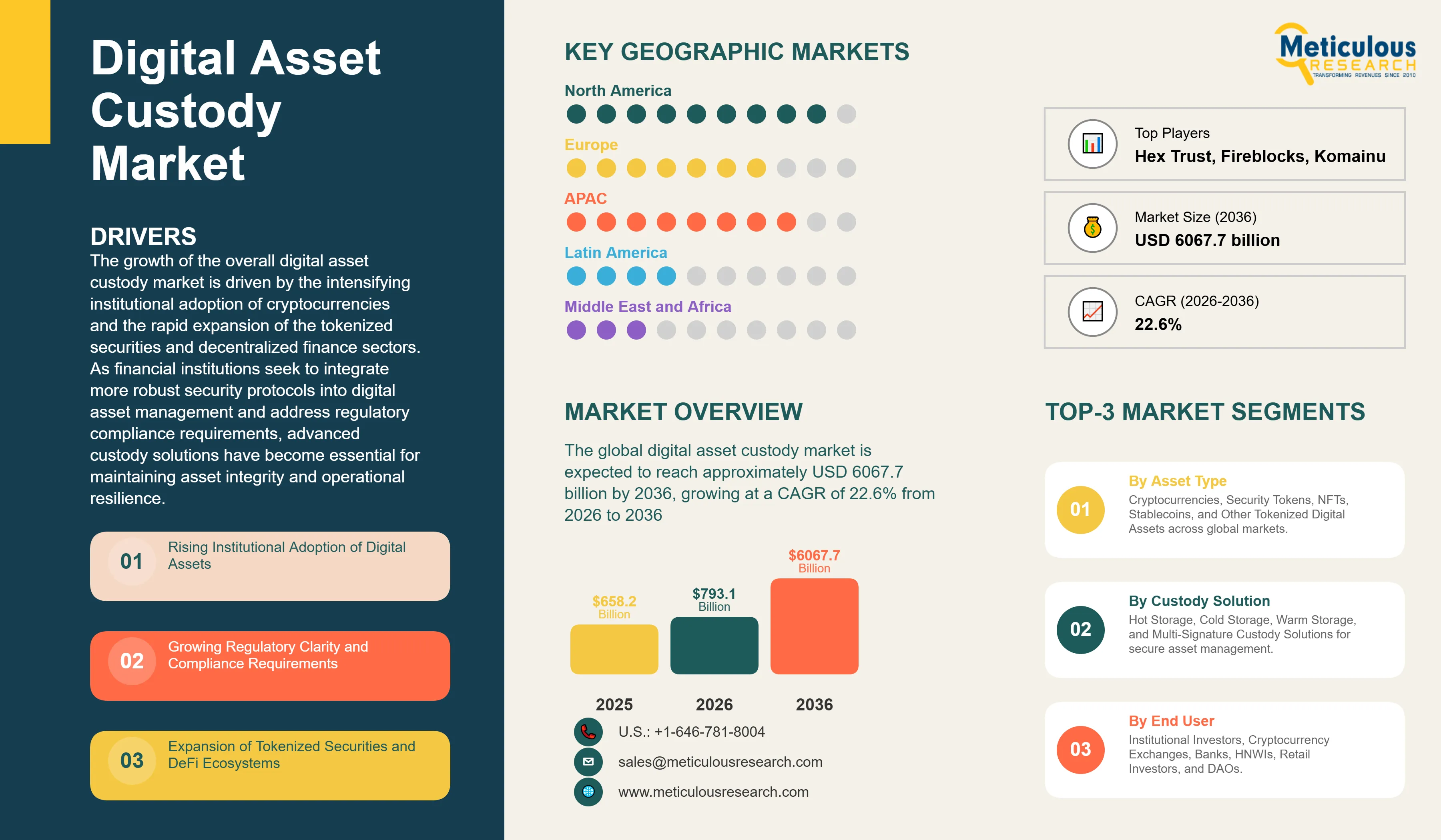 Report ID: MRICT - 1041729 Pages: 178 Feb-2026 Formats*: PDF Category: Information and Communications Technology Delivery: 24 to 72 Hours Download Free Sample ReportThe global digital asset custody market was valued at USD 658.2 billion in 2025. The market is expected to reach approximately USD 6067.7 billion by 2036 from USD 793.1 billion in 2026, growing at a CAGR of 22.6% from 2026 to 2036. The growth of the overall digital asset custody market is driven by the intensifying institutional adoption of cryptocurrencies and the rapid expansion of the tokenized securities and decentralized finance sectors. As financial institutions seek to integrate more robust security protocols into digital asset management and address regulatory compliance requirements, advanced custody solutions have become essential for maintaining asset integrity and operational resilience. The rapid expansion of the blockchain infrastructure and the increasing need for high-security multi-signature systems and hardware security modules continue to fuel significant growth of this market across all major geographic regions.