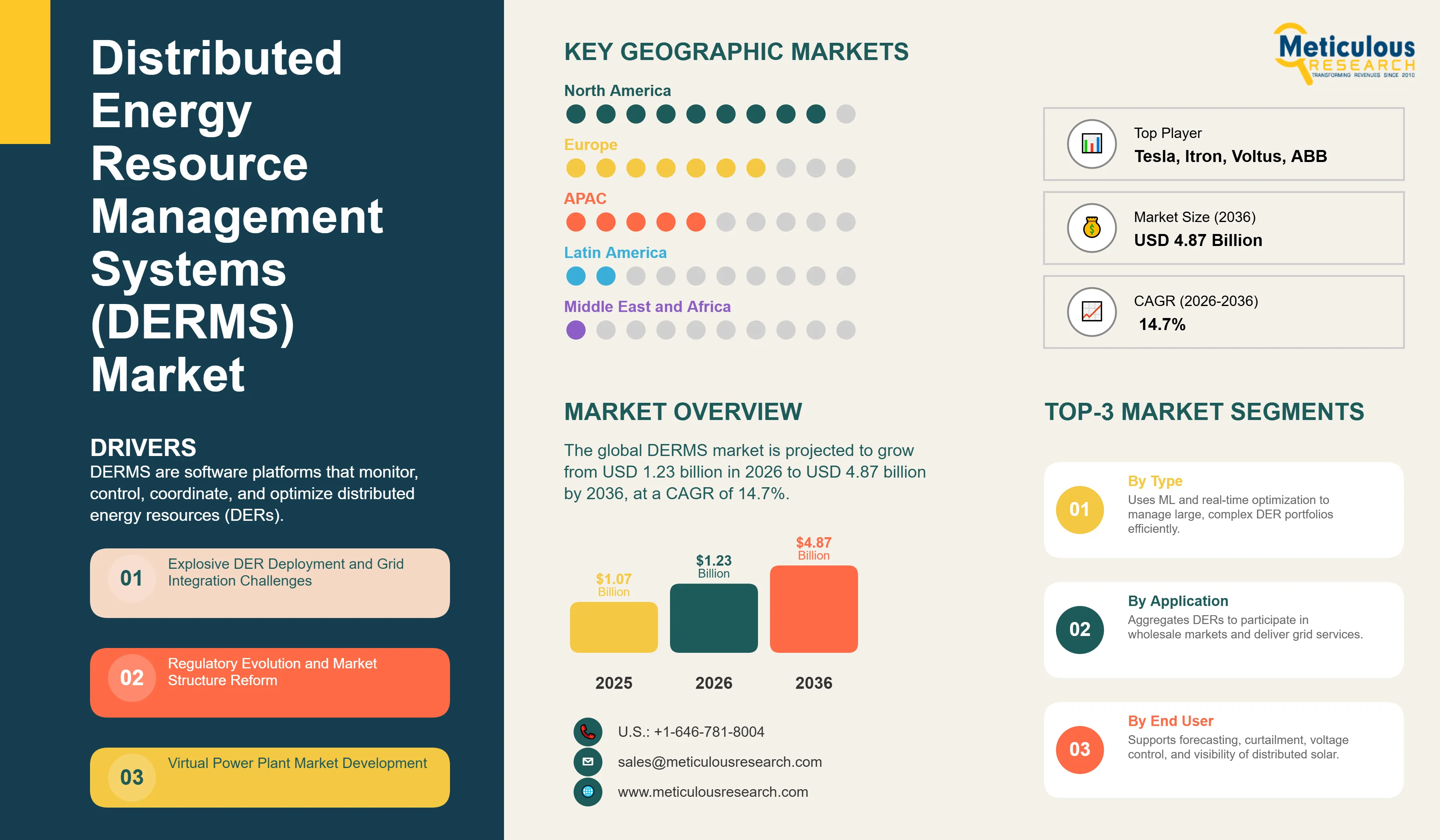 Report ID: MREP - 1041682 Pages: 281 Jan-2026 Formats*: PDF Category: Energy and Power Delivery: 24 to 72 Hours Download Free Sample ReportThe global distributed energy resource management systems (DERMS) market is expected to reach USD 4.87 billion by 2036 from USD 1.23 billion in 2026, at a CAGR of 14.7% from 2026 to 2036.