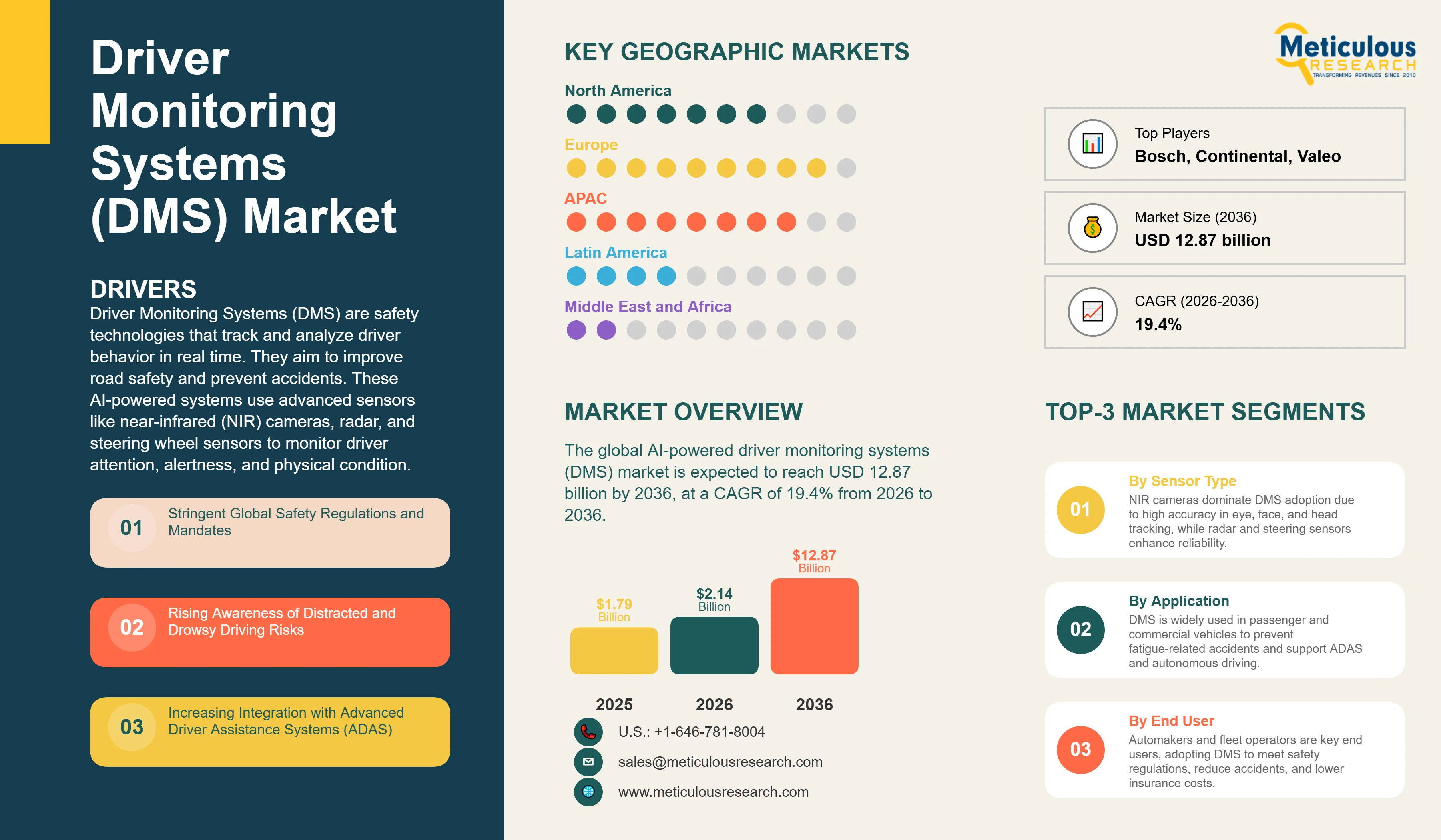 Driver Monitoring Systems (DMS) Market (AI-Powered) Size, Share, & Forecast by Sensor Type (NIR Camera, Radar), AI Algorithm (Drowsiness, Distraction, Impairment), Regulatory Compliance, and OEM Integration - Global Forecast to 2036