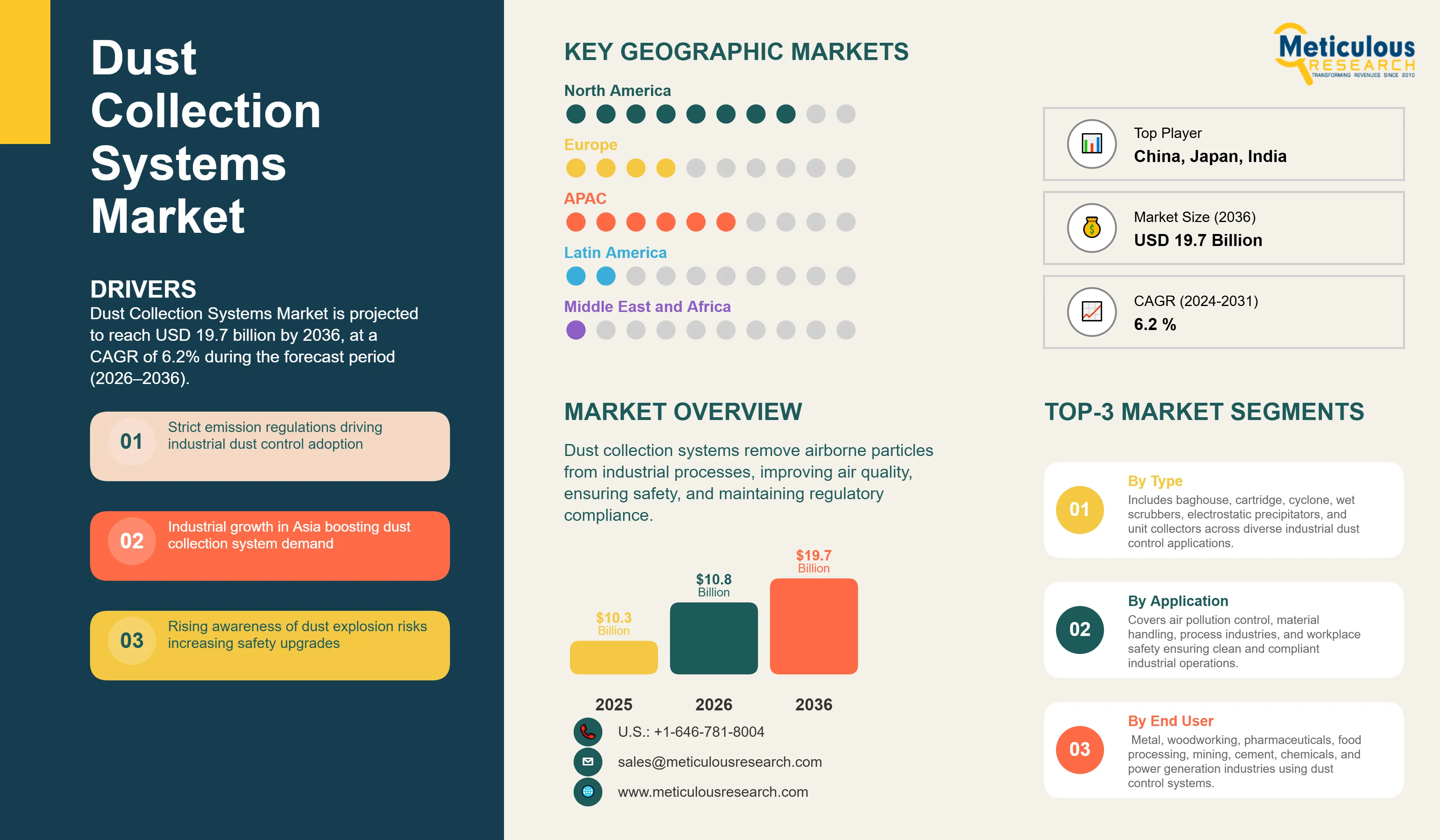 The growth of this market is primarily driven by the tightening of occupational health and environmental regulations globally, including the adoption of NFPA 660, OSHA enforcement programs, and the EU Ambient Air Quality Directive revision, sustained industrial expansion in Asia Pacific, the integration of IoT-enabled monitoring into dust collection system platforms, and the growing adoption of high-efficiency cartridge and wet scrubbing technologies across pharmaceutical, food processing, and chemical manufacturing sectors.