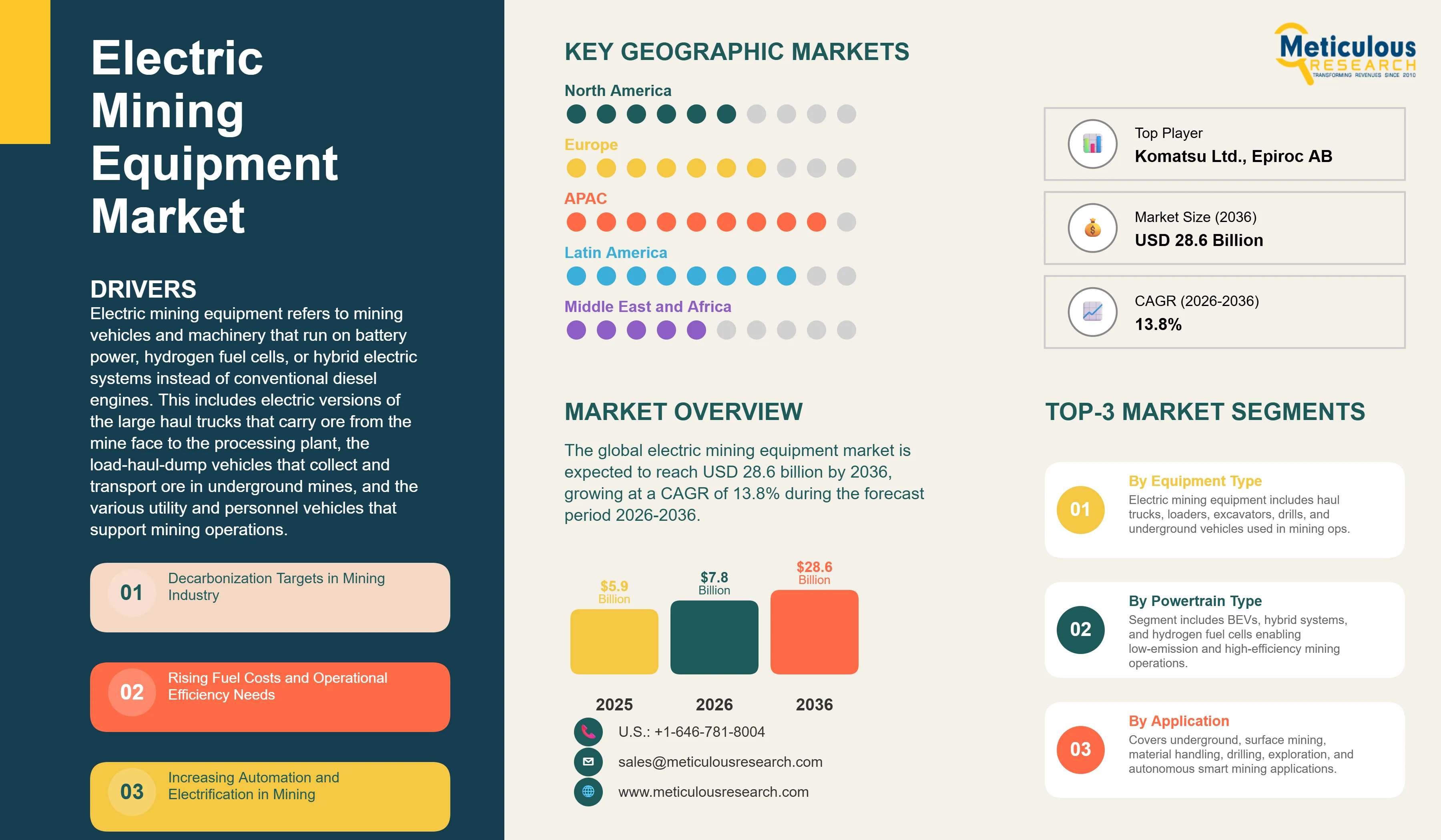 The market is primarily driven by mining companies' formal decarbonization commitments requiring fleet electrification as the primary pathway to reducing diesel combustion emissions, and by the strong financial case for electrification driven by diesel fuel cost savings and underground ventilation energy cost reductions that make electric equipment increasingly competitive with diesel alternatives on total cost of ownership.