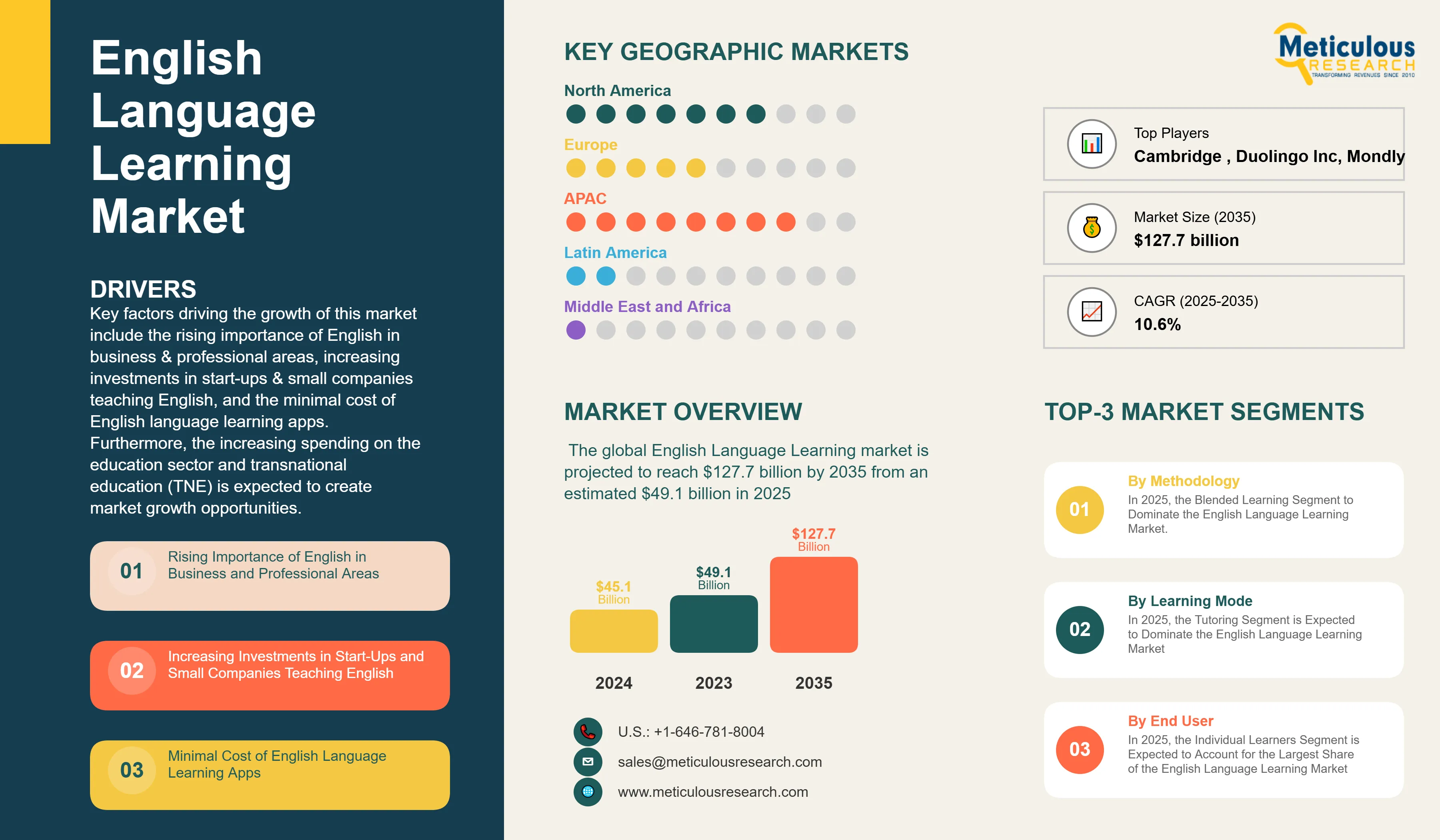 Report ID: MRICT - 104431 Pages: 295 May-2025 Formats*: PDF Category: Information and Communications Technology Delivery: 24 to 48 Hours Download Free Sample ReportKey factors driving the growth of this market include the rising importance of English in business & professional areas, increasing investments in start-ups & small companies teaching English, and the minimal cost of English language learning apps. Furthermore, the increasing spending on the education sector and transnational education (TNE) is expected to create market growth opportunities.