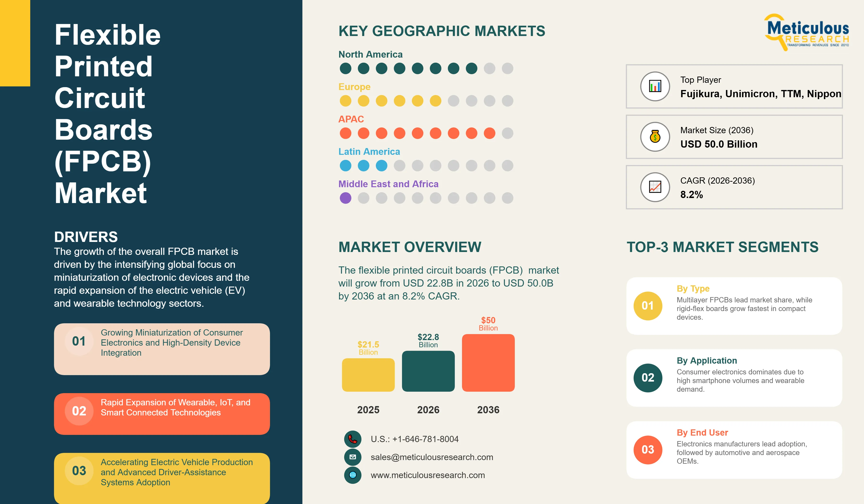Report ID: MRSE - 1041707 Pages: 176 Feb-2026 Formats*: PDF Category: Semiconductor and Electronics Delivery: 24 to 72 Hours Download Free Sample ReportThe global flexible printed circuit boards (FPCB) market was valued at USD 21.5 billion in 2025. The market is expected to reach approximately USD 50.0 billion by 2036 from USD 22.8 billion in 2026, growing at a CAGR of 8.2% from 2026 to 2036. The growth of the overall FPCB market is driven by the intensifying global focus on miniaturization of electronic devices and the rapid expansion of the electric vehicle (EV) and wearable technology sectors. As manufacturers seek to integrate more functionality into smaller, lighter, and more complex form factors, flexible circuitry has become essential for maintaining high-speed signal integrity and mechanical durability. The rapid expansion of the 5G infrastructure and the increasing need for high-density interconnect (HDI) solutions in foldable smartphones and advanced driver-assistance systems (ADAS) continue to fuel significant growth of this market across all major geographic regions.