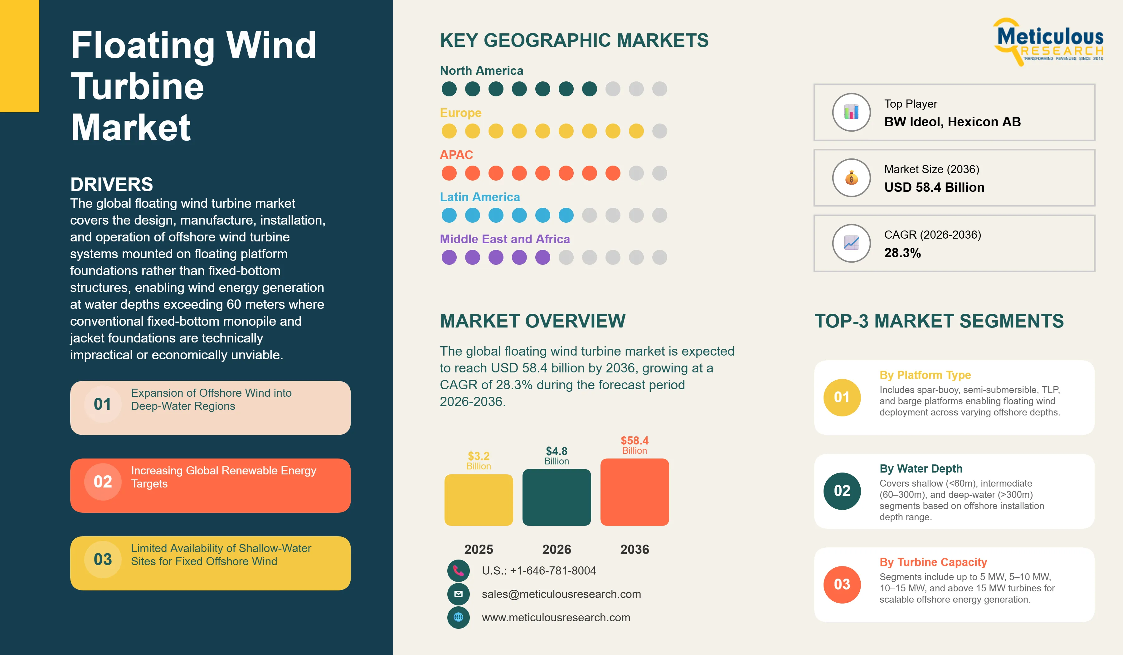 The global floating wind turbine market is expected to reach USD 58.4 billion by 2036 from an estimated USD 4.8 billion in 2026, at a CAGR of 28.3% during the forecast period 2026-2036.