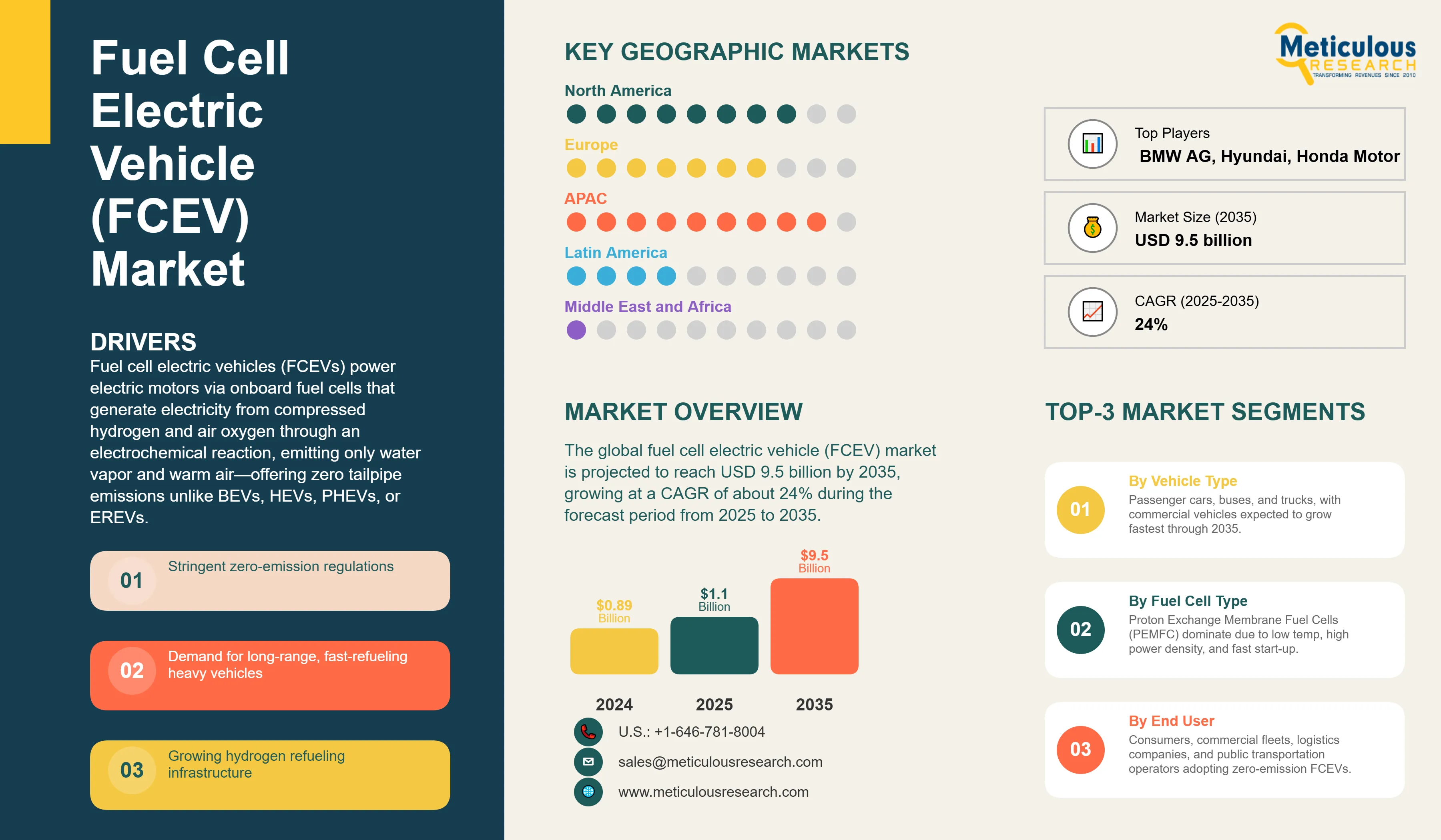 The fuel cell electric vehicle market is expected to grow from USD 1.1 billion in 2025 to USD 9.5 billion by 2035.