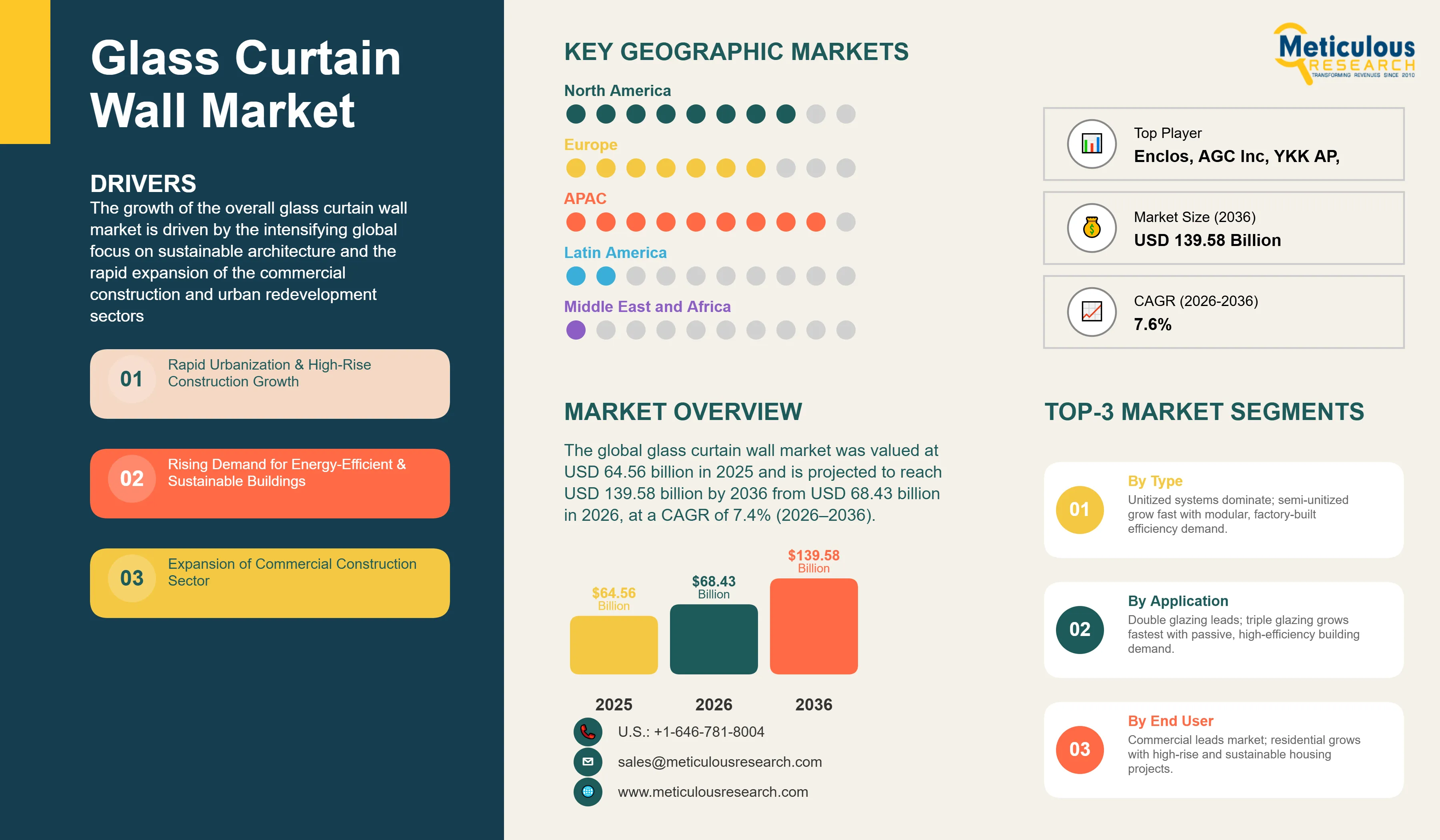 Report ID: MRCHM - 1041718 Pages: 162 Feb-2026 Formats*: PDF Category: Chemicals and Materials Delivery: 24 to 72 Hours Download Free Sample ReportThe global glass curtain wall market was valued at USD 64.56 billion in 2025. The market is expected to reach approximately USD 139.58 billion by 2036 from USD 68.43 billion in 2026, growing at a CAGR of 7.4% from 2026 to 2036. The growth of the overall glass curtain wall market is driven by the intensifying global focus on sustainable architecture and the rapid expansion of the commercial construction and urban redevelopment sectors. As developers seek to integrate more functionality into building envelopes and energy management systems, glass curtain wall infrastructure has become essential for maintaining high-performance thermal efficiency and aesthetic appeal. The rapid expansion of smart city initiatives and the increasing need for high-performance glazing in high-rise residential and commercial complexes continue to fuel significant growth of this market across all major geographic regions.