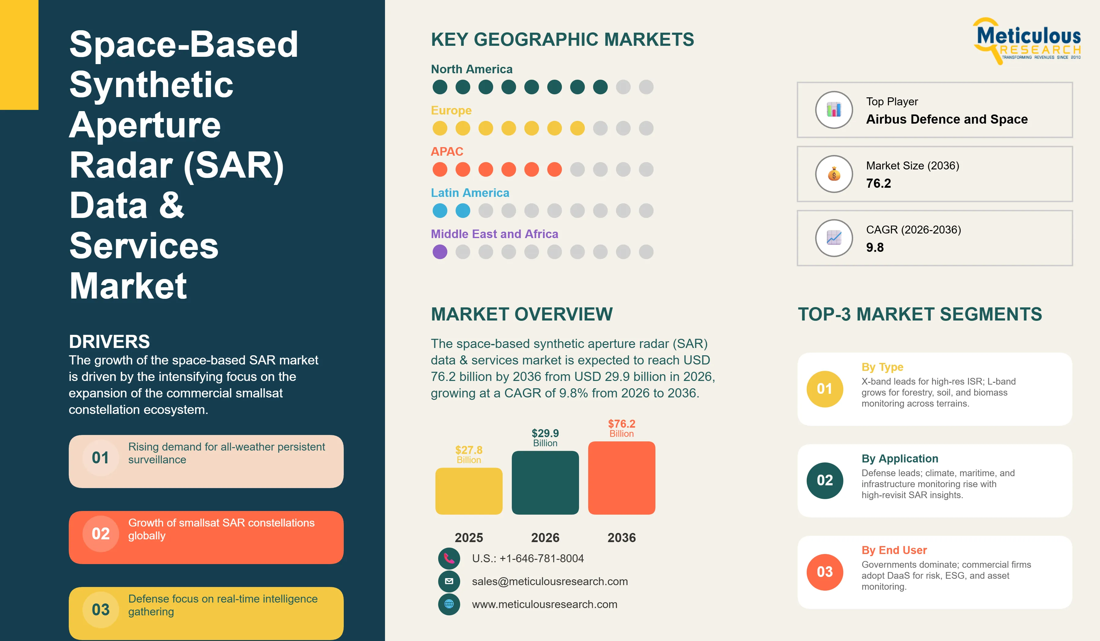 The global space-based synthetic aperture radar (SAR) data & services market was valued at USD 27.8 billion in 2025. The market is expected to reach approximately USD 76.2 billion by 2036 from USD 29.9 billion in 2026, growing at a CAGR of 9.8% from 2026 to 2036. The growth of the overall space-based SAR market is driven by the intensifying global focus on persistent surveillance and the rapid expansion of the commercial smallsat constellation ecosystem. As defense and intelligence agencies seek to achieve all-weather, day-and-night reconnaissance and commercial sectors demand high-revisit Earth observation data, SAR technologies have become essential for global security and environmental stewardship. The rapid expansion of the maritime and infrastructure monitoring sectors, coupled with the increasing need for high-resolution disaster response solutions and sustainable resource management, continues to fuel significant growth of this market across all major geographic regions.