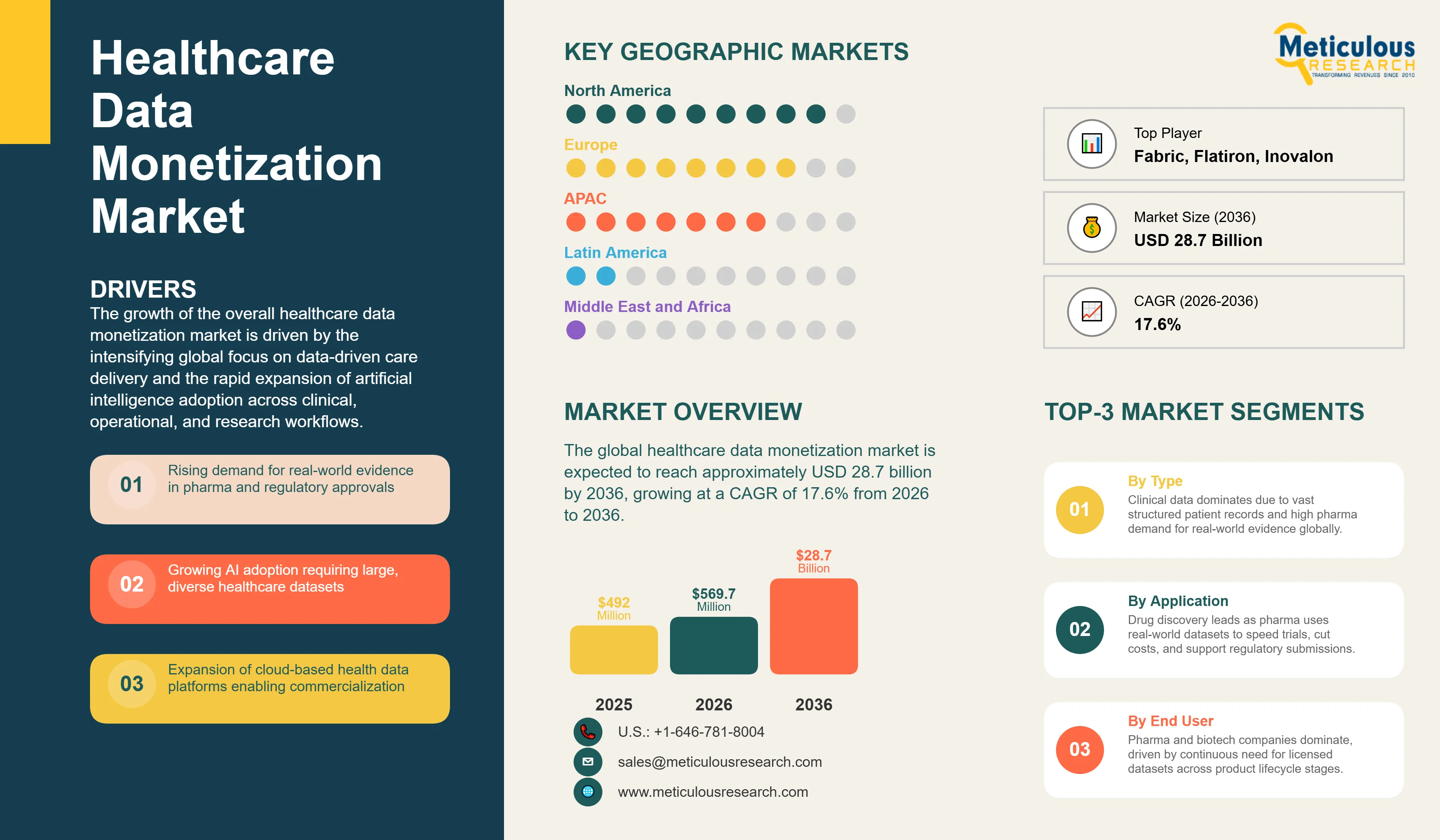 Report ID: MRHC - 1041791 Pages: 287 Feb-2026 Formats*: PDF Category: Healthcare Delivery: 24 to 72 Hours Download Free Sample ReportThe global healthcare data monetization market was valued at USD 492.0 million in 2025. The market is expected to reach approximately USD 28.7 billion by 2036 from USD 569.7 million in 2026, growing at a CAGR of 17.6% from 2026 to 2036. The growth of the overall healthcare data monetization market is driven by the intensifying global focus on data-driven care delivery and the rapid expansion of artificial intelligence adoption across clinical, operational, and research workflows. As healthcare organizations seek to unlock the commercial and strategic value embedded in their data assets, data monetization has become essential for sustaining competitive advantage, improving patient outcomes, and driving revenue diversification. The rapid expansion of real-world evidence programs, the growing demand for high-quality health datasets among pharmaceutical companies, and the increasing integration of digital health technologies continue to fuel significant growth of this market across all major geographic regions.