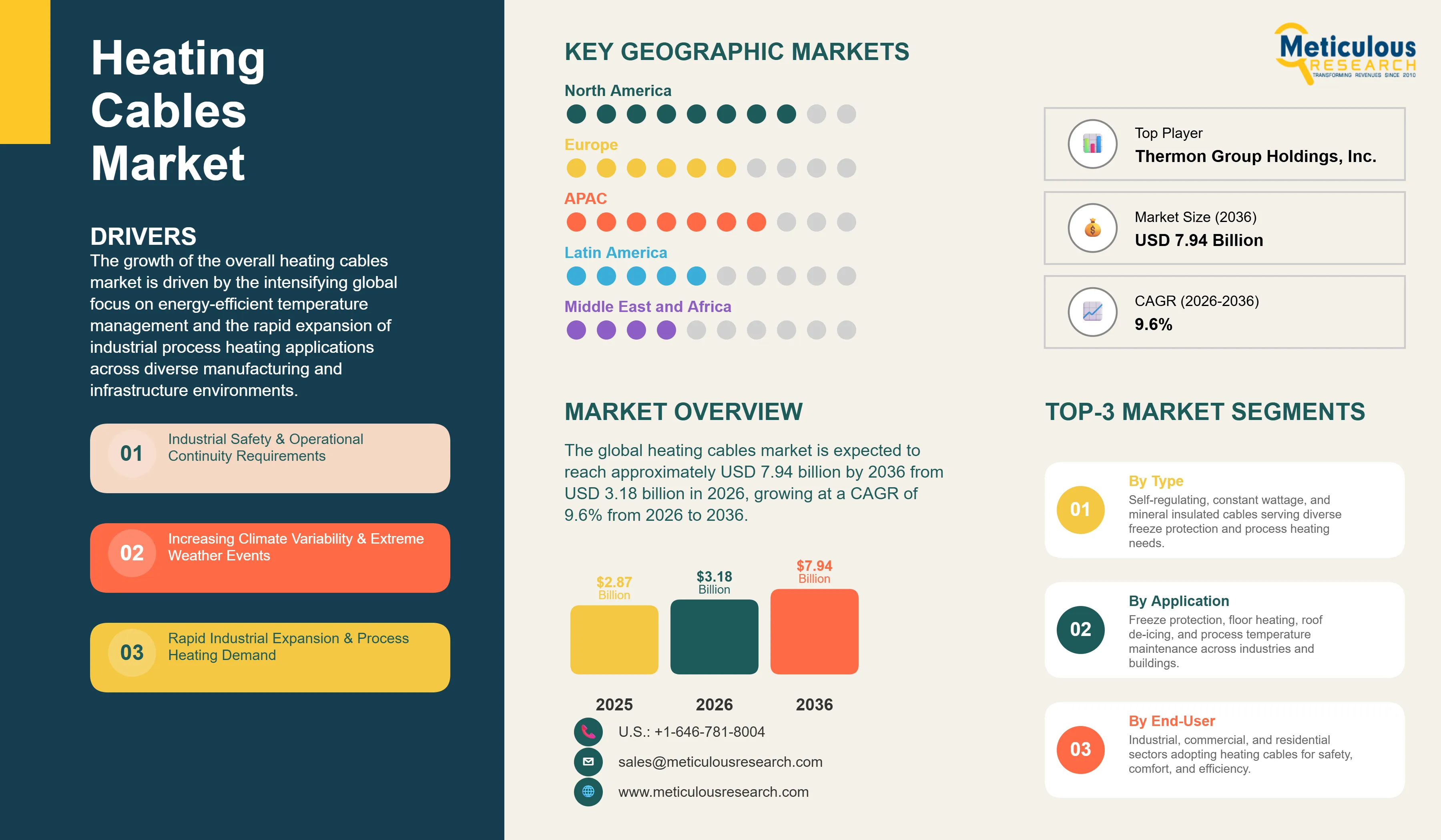 Report ID: MRSE - 1041817 Pages: 262 Mar-2026 Formats*: PDF Category: Semiconductor and Electronics Delivery: 24 to 72 Hours Download Free Sample ReportThe global heating cables market was valued at USD 2.87 billion in 2025. The market is expected to reach approximately USD 7.94 billion by 2036 from USD 3.18 billion in 2026, growing at a CAGR of 9.6% from 2026 to 2036. The growth of the overall heating cables market is driven by the intensifying global focus on energy-efficient temperature management and the rapid expansion of industrial process heating applications across diverse manufacturing and infrastructure environments. As enterprises seek to integrate more reliability into their freeze protection systems and address the increasing demand for precise temperature control in harsh climate conditions, advanced heating cable solutions have become essential for maintaining operational continuity and safety standards. The rapid expansion of smart building technologies and the increasing need for automated thermal management in residential floor heating and commercial pipe protection continue to fuel significant growth of this market across all major geographic regions.