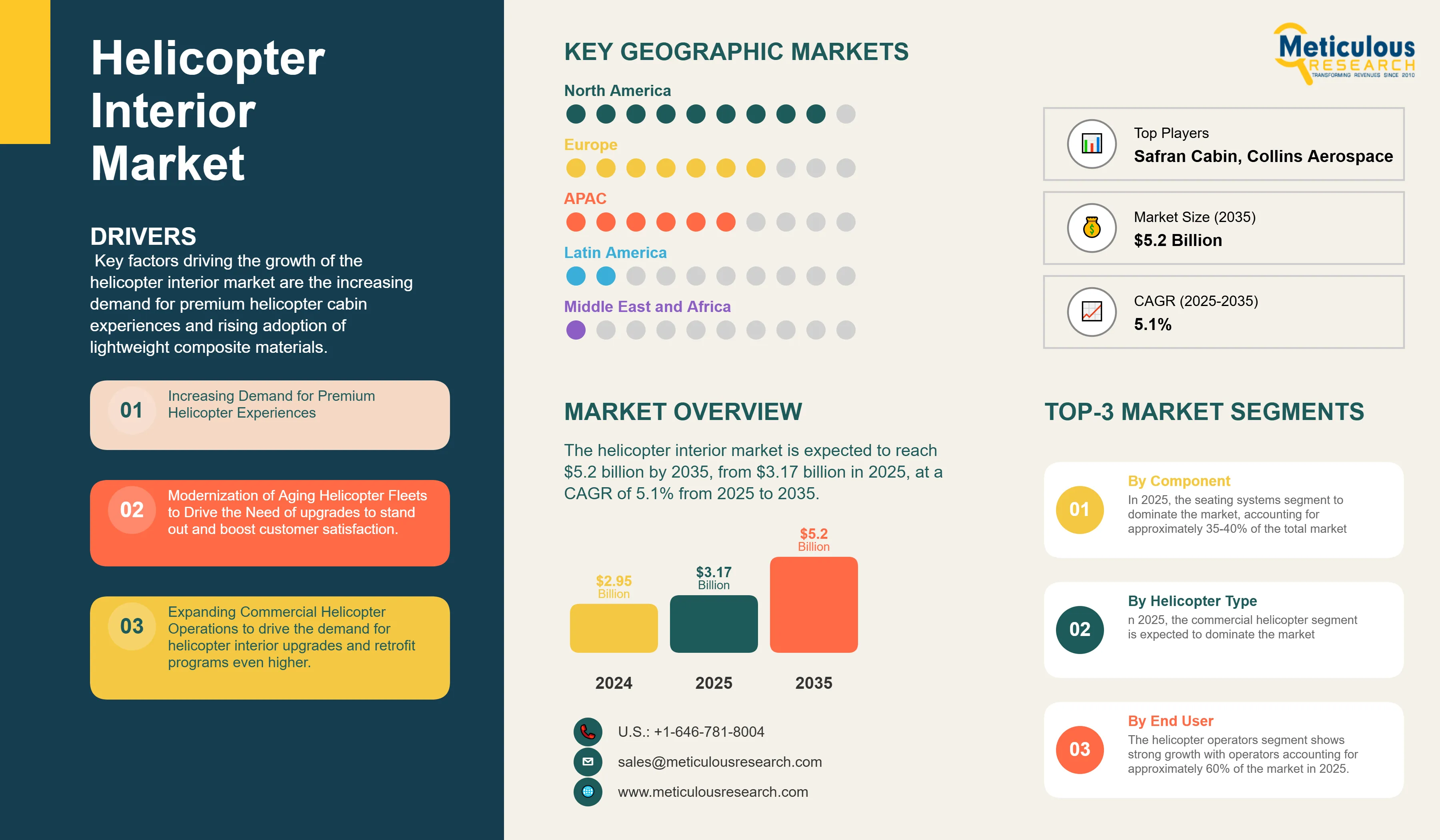 Leading players in the global helicopter interior market are Safran Cabin, Collins Aerospace, Mecaer Aviation Group, Diehl Aviation, Aircraft Cabin Modification GmbH, Jet Aviation, Duncan Aviation, Haeco Private Jet Solutions, Recaro Aircraft Seating, Sabeti Wain Aerospace, Air Livery, SkyArt Aerospace, Rotorcorp, Premium Aircraft Interiors, Aviointeriors S.p.A, among others.