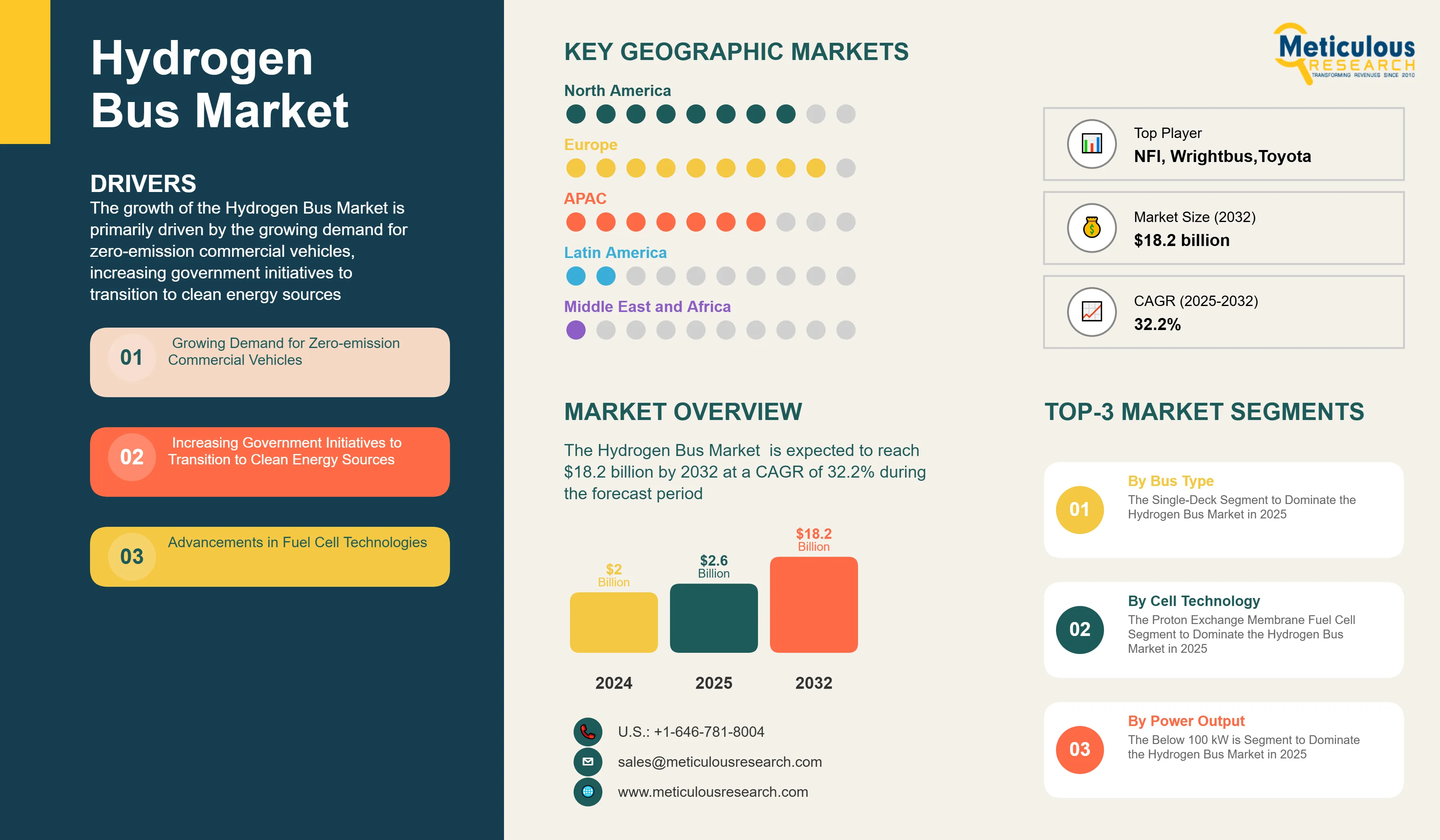 Hydrogen Bus Market Size, Share, Forecast, & Trends Analysis by Bus Type (Single Deck, Articulated Deck), Cell Technology (Proton Exchange Membrane Fuel Cell, Solid Oxide Fuel Cell, Alkaline Fuel Cell), Power Output (Below 100 kW, 100-200 kW) and Geography—Global Forecast to 2032