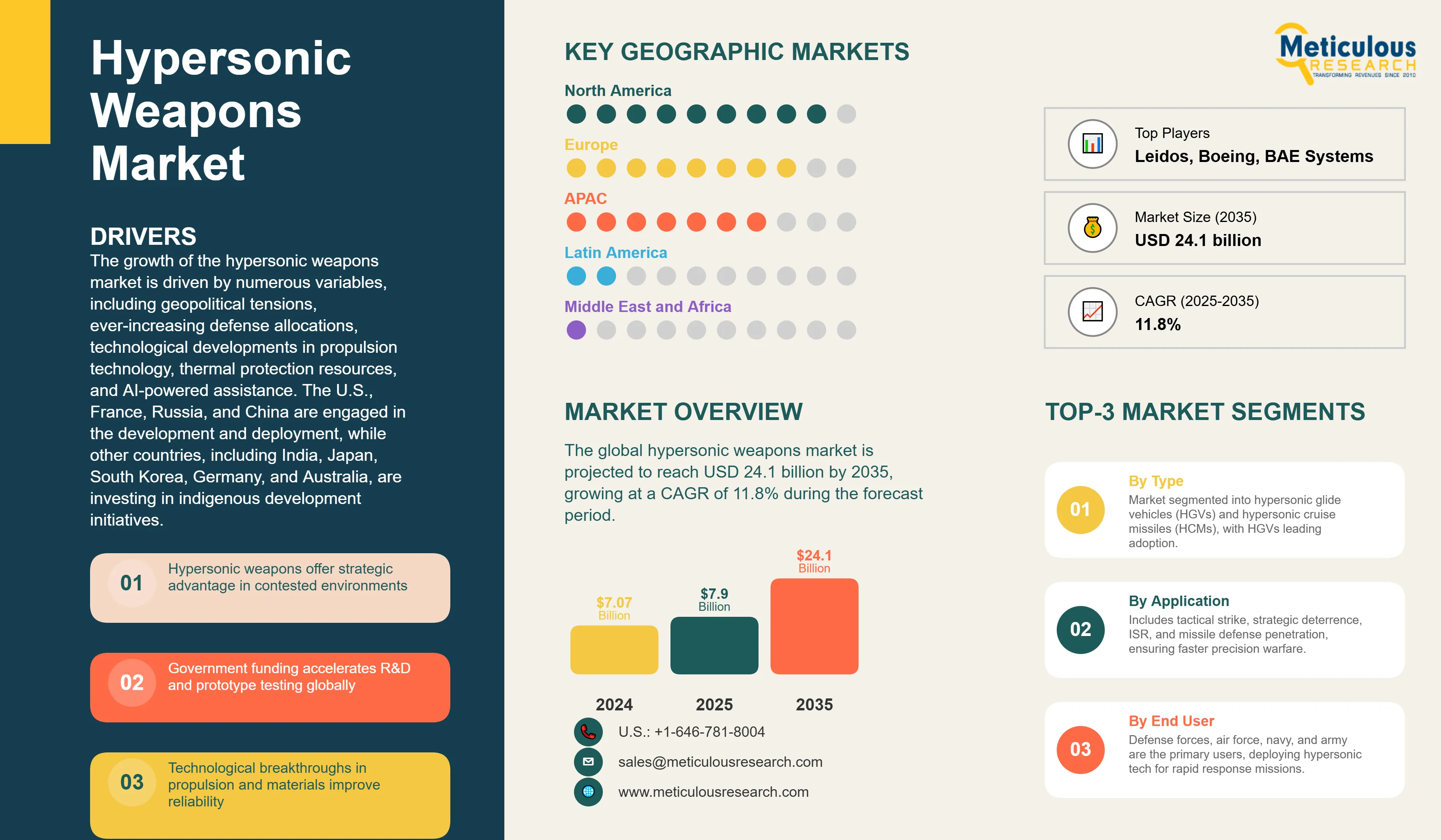 The Hypersonic Weapons Market size is estimated to be USD 7.9 billion in 2025 and grow at a CAGR of 11.8% to reach USD 24.1 billion by 2035.