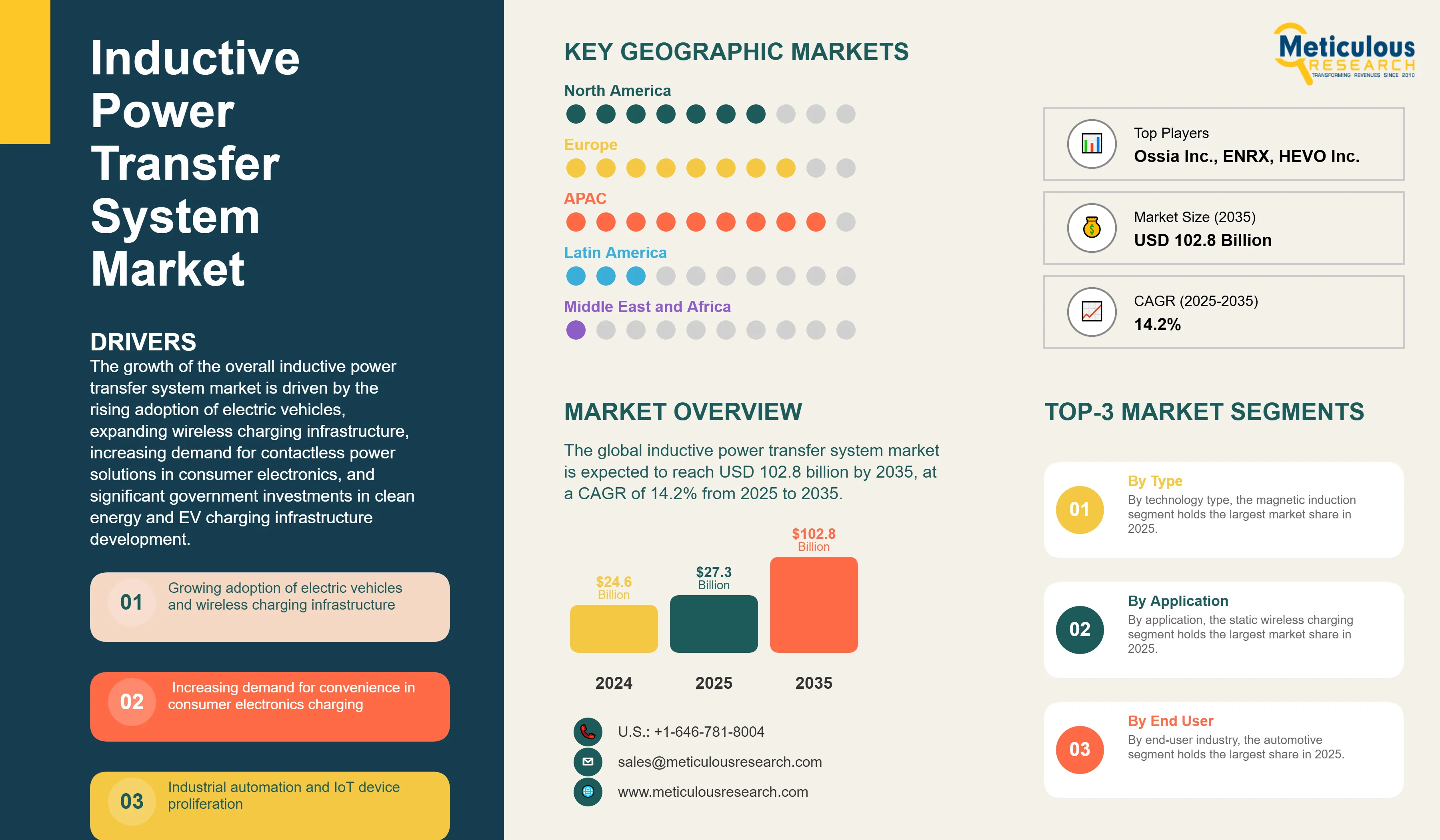Inductive Power Transfer System Market by Technology (Magnetic Induction, Magnetic Resonance, RF Power Transfer, Microwave Power Transfer, Laser Power Transmission), Power Range, Application, End-User, and Geography—Global Forecast to 2035