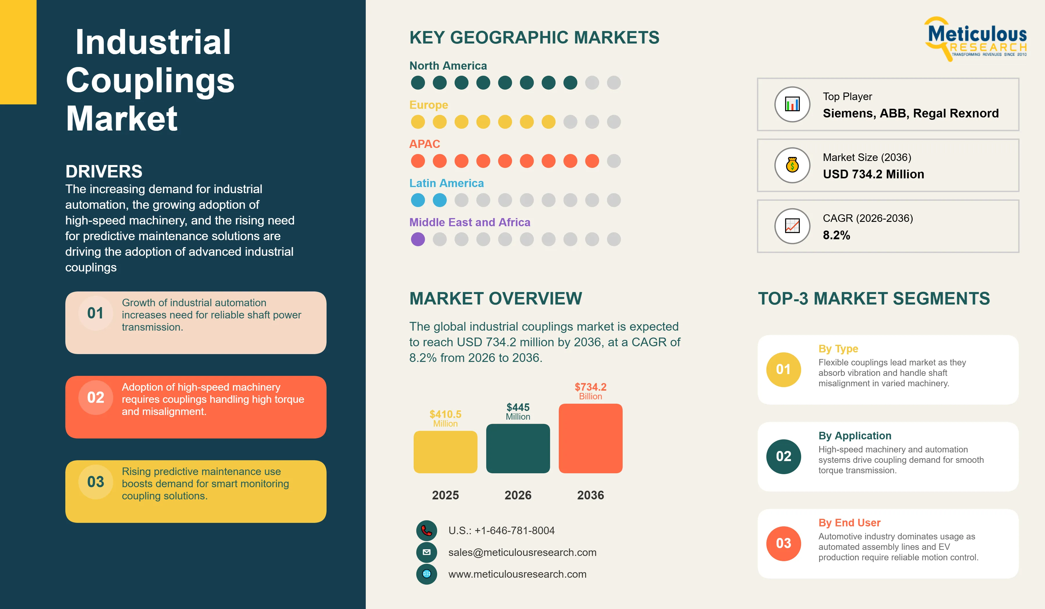 The key factors driving the growth of the industrial couplings market are the increasing industrial automation, the growing adoption of high-speed machinery, the rising demand for predictive maintenance solutions, and the expansion of the renewable energy sector.