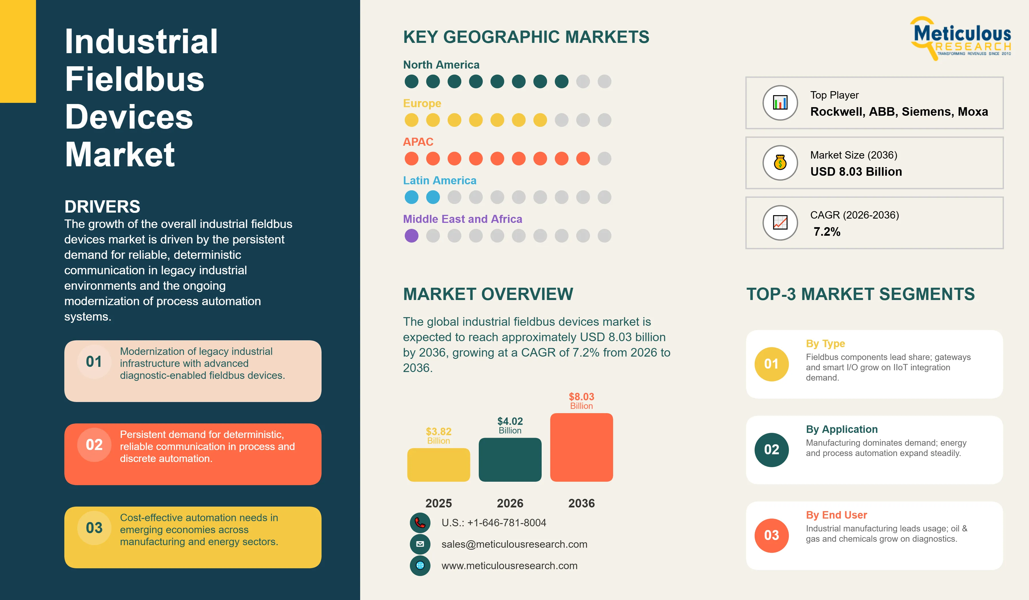 Industrial Fieldbus Devices Market by Product (Fieldbus Components, Fieldbus Software, Fieldbus Services), Protocol (PROFIBUS, Modbus, CANopen, DeviceNet, Foundation Fieldbus, Others), Application (Manufacturing, Energy & Utilities, Oil & Gas, Water & Wastewater, Mining) – Global Forecast to 2036
