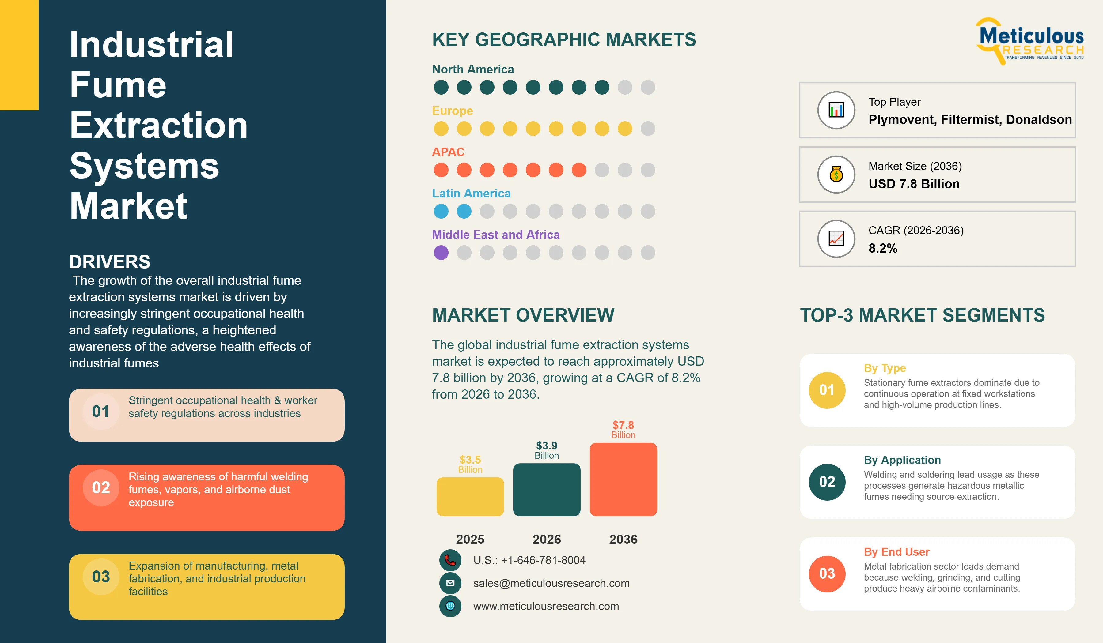 Report ID: MRSE - 1041815 Pages: 270 Feb-2026 Formats*: PDF Category: Semiconductor and Electronics Delivery: 24 to 72 Hours Download Free Sample ReportThe global industrial fume extraction systems market was valued at USD 3.5 billion in 2025. The market is expected to reach approximately USD 7.8 billion by 2036 from USD 3.9 billion in 2026, growing at a CAGR of 8.2% from 2026 to 2036. The growth of the overall industrial fume extraction systems market is driven by increasingly stringent occupational health and safety regulations, a heightened awareness of the adverse health effects of industrial fumes, and the continuous expansion of manufacturing and industrial activities globally. As industries strive to protect their workforce from hazardous airborne contaminants such as welding fumes, chemical vapors, and dust, the demand for efficient and reliable fume extraction solutions is escalating. Furthermore, technological advancements in filtration media, fan design, and smart control systems are enhancing the performance and energy efficiency of these systems, making them more attractive to a wider range of industrial applications. The integration of IoT for real-time monitoring and predictive maintenance is also contributing to market expansion.